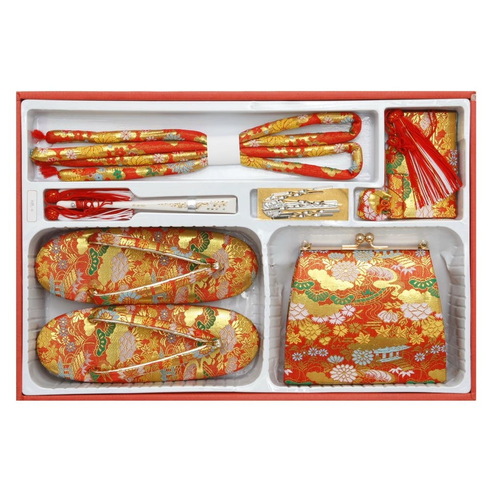 ■着物セット・着物・帯・長襦袢(半衿つき)・帯揚・兵児帯(しごき)・腰ひも4本・伊達締め・足袋・肌襦袢・三重紐・帯板・帯枕・裾除け■箱迫セット・帯締め・御びら簪・バッグ・草履・箱せこ・扇子