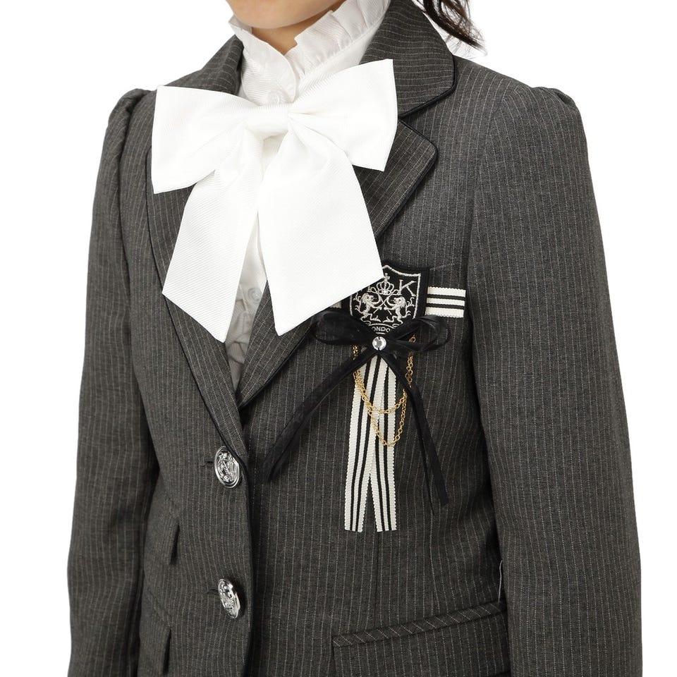 ジャケットスカートブラウスリボンコサージュパールネックレス