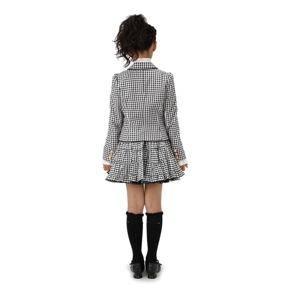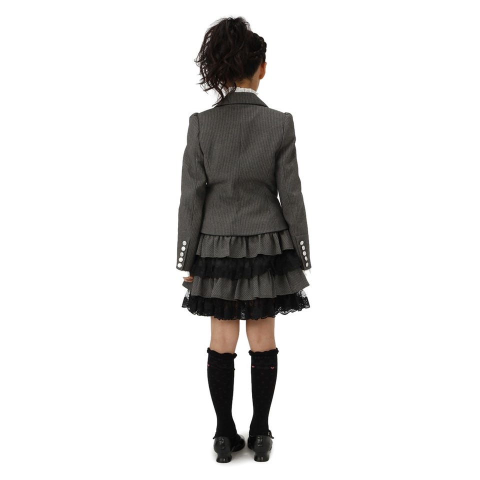 ピンストライプ柄の生地を使用したジャケットとフリルを交互に組み合わせたティアードスカート。