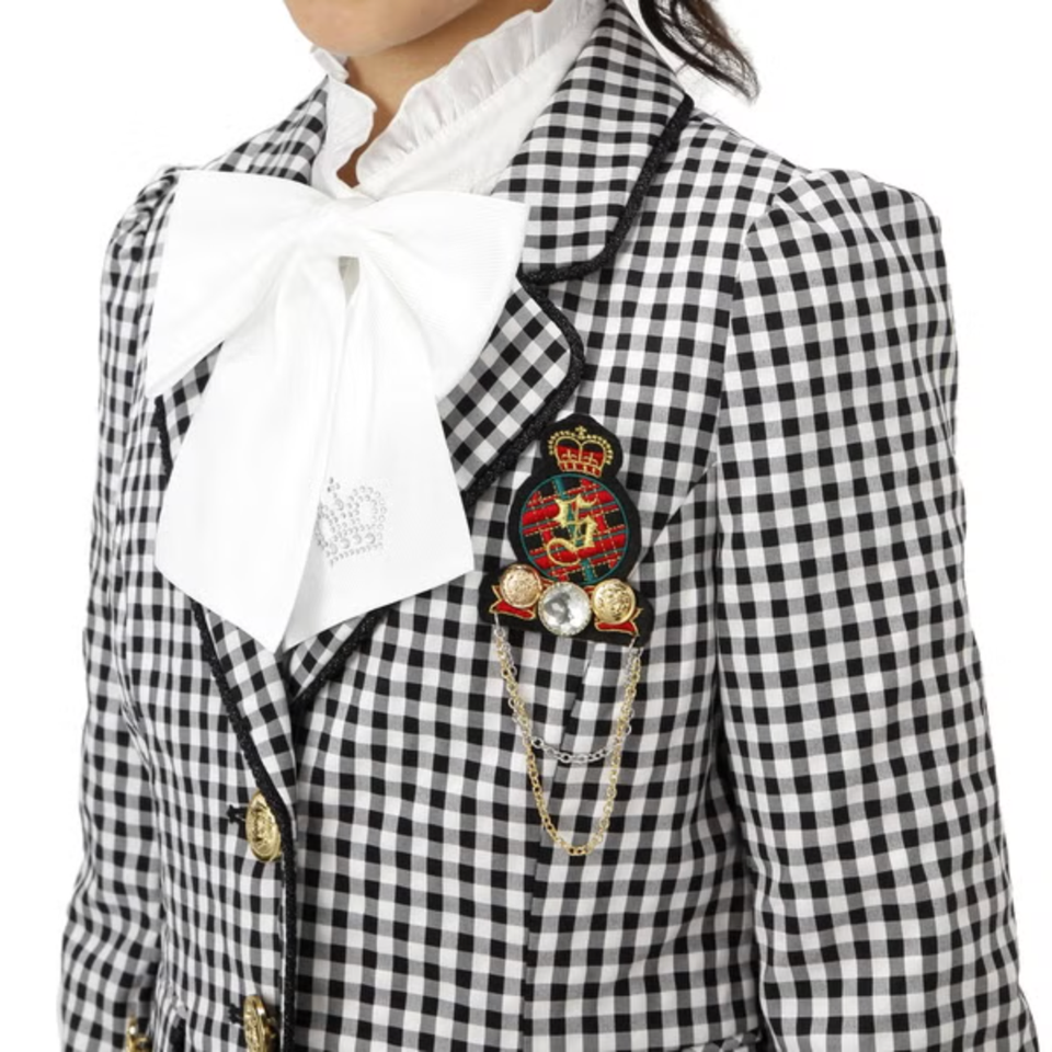 オシャレなブローチがついたギンガムチェック柄のセットアップスーツとブラウスの3点セット。