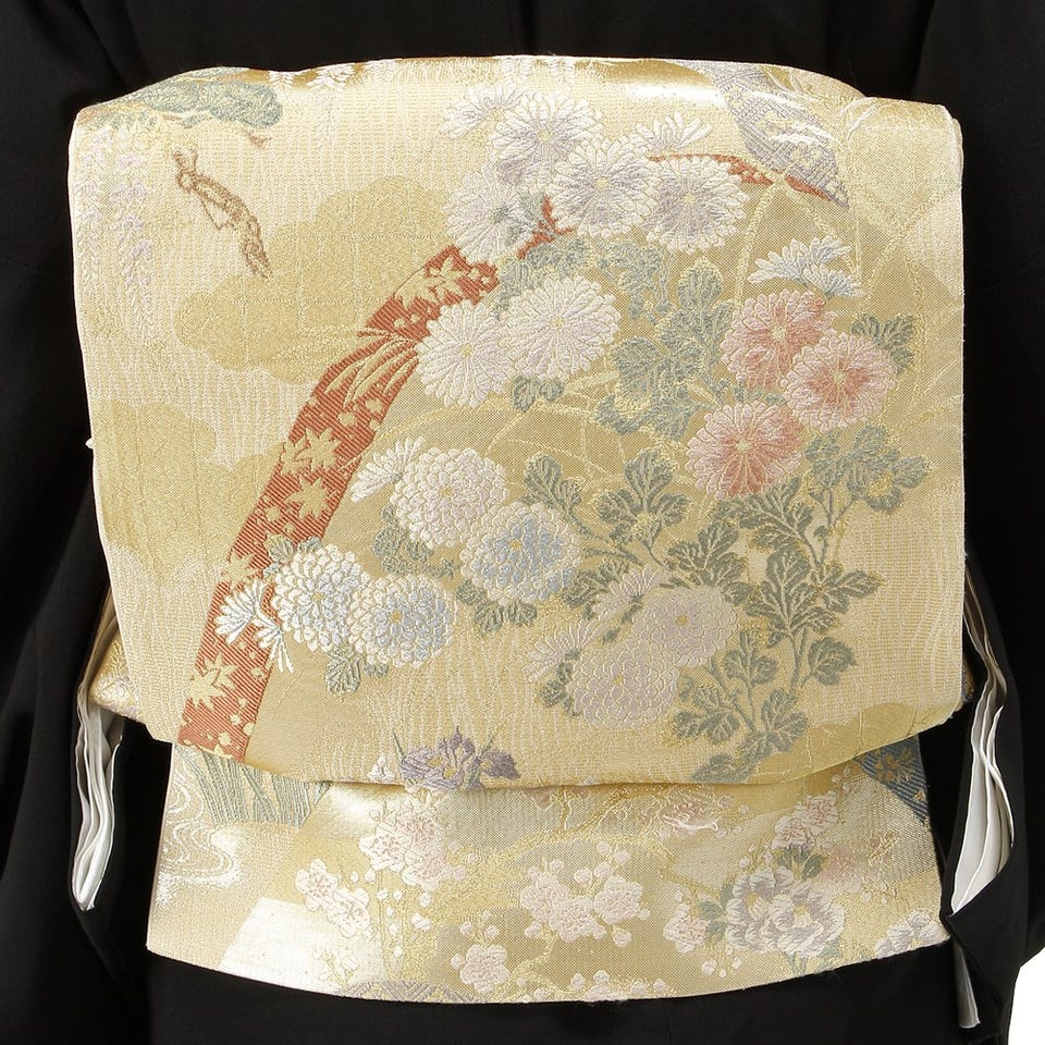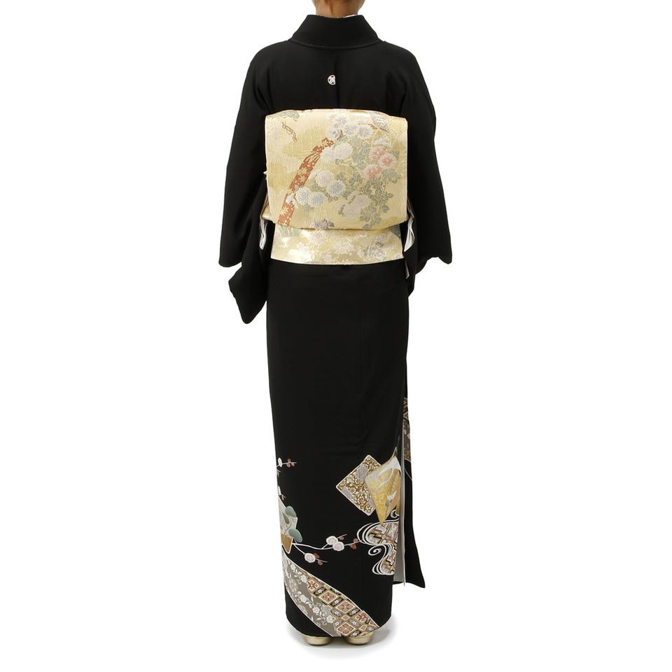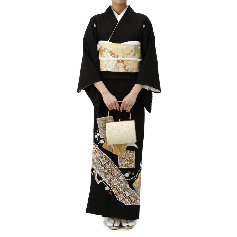 シックな黒地に控えめなスクエアの模様を施した留袖のセットです。菊の花をあしらった帯も華やかさを添えます。裾に描かれた柄のボリュームが少ない分、帯が存在感を放つ着こなしに。着物や帯、バッグなどのアイテムだけでなく、和装に必要なアイテムはすべて揃うセットです。