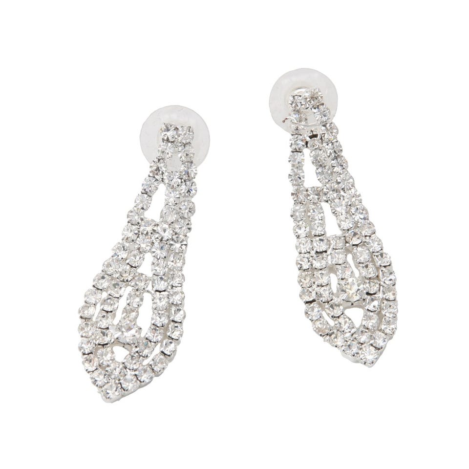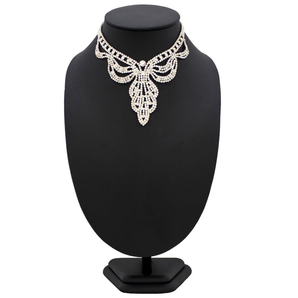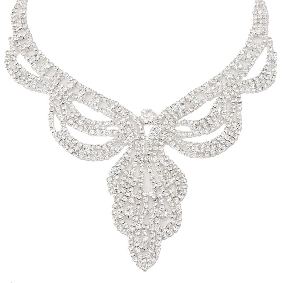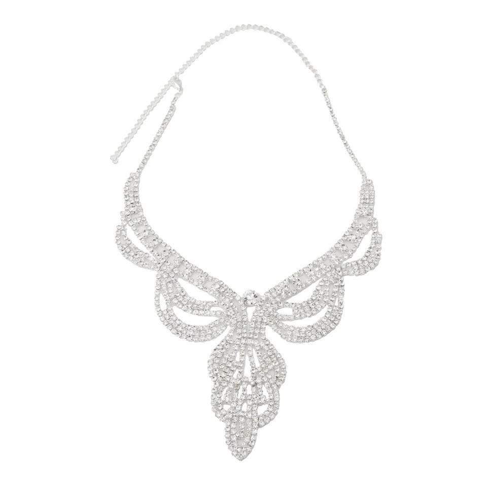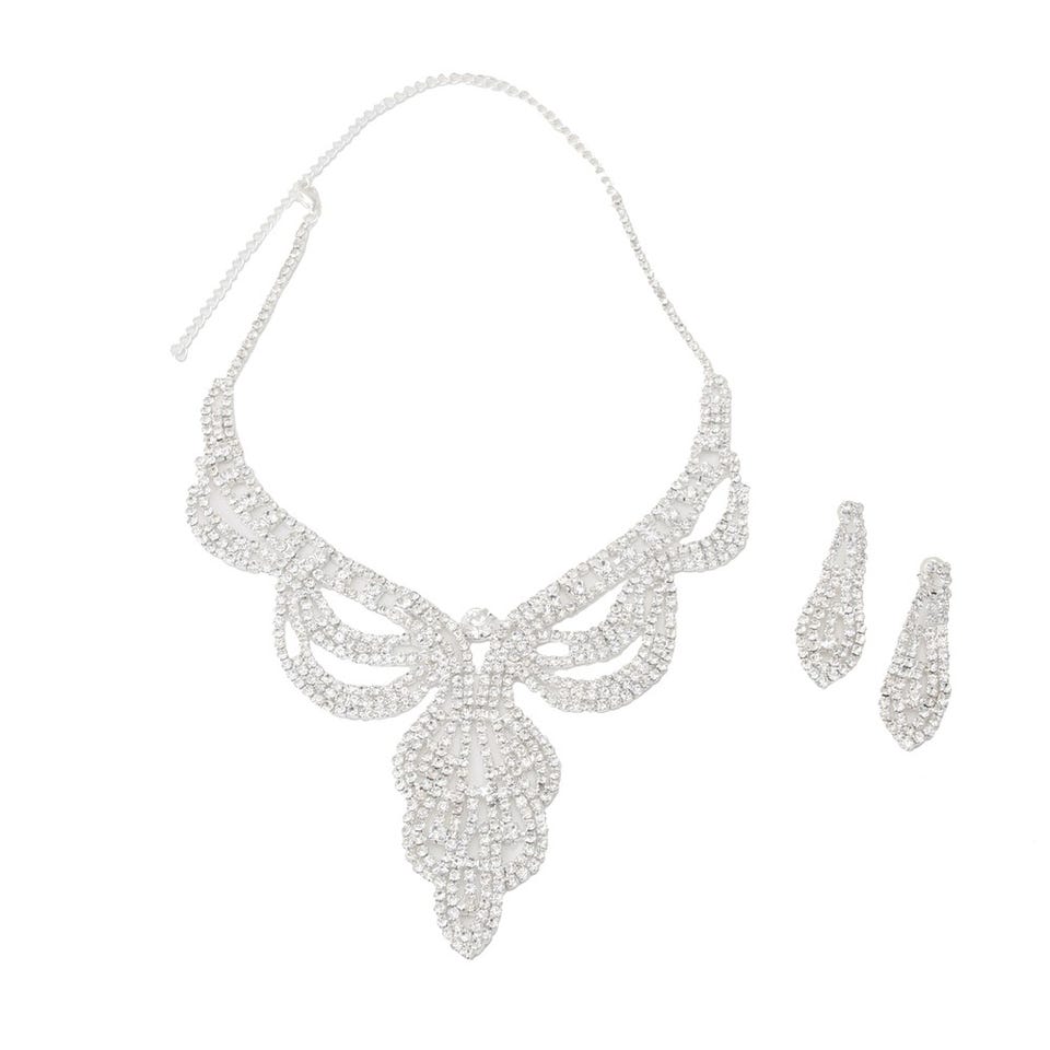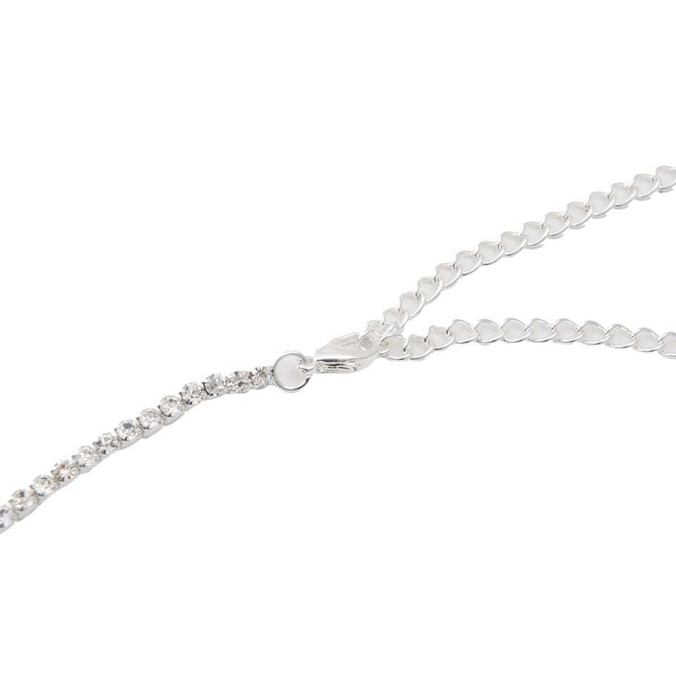 キラキラと輝く華やかなラインストーンをふんだんに散りばめたネックレスとピアスのセット。さりげなく首元にあしらうだけで文句無しの存在感を演出します。ベーシックなネックレスでは物足りないという人にもおすすめのデザイン。長さ調節が可能なアジャスター付き。