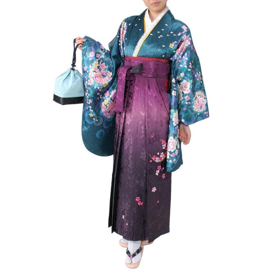 深みのあるブルーグリーンの地に水玉と花の模様を描いた華やかな着物とグラデーションがかった紫の袴のセット。襟元にはレースをあしらうことで女性らしさを演出。卒業式や入学式のほか、結婚式などの華やかなシーンにもおすすめのデザイン。小物も付いた安心のパック。