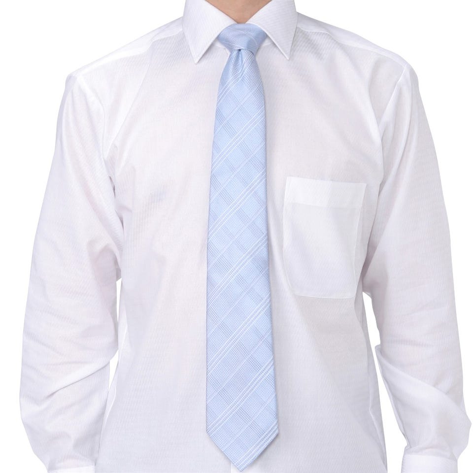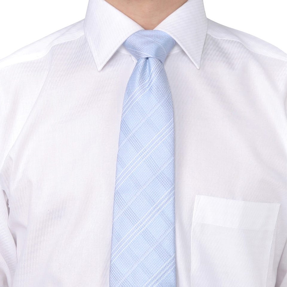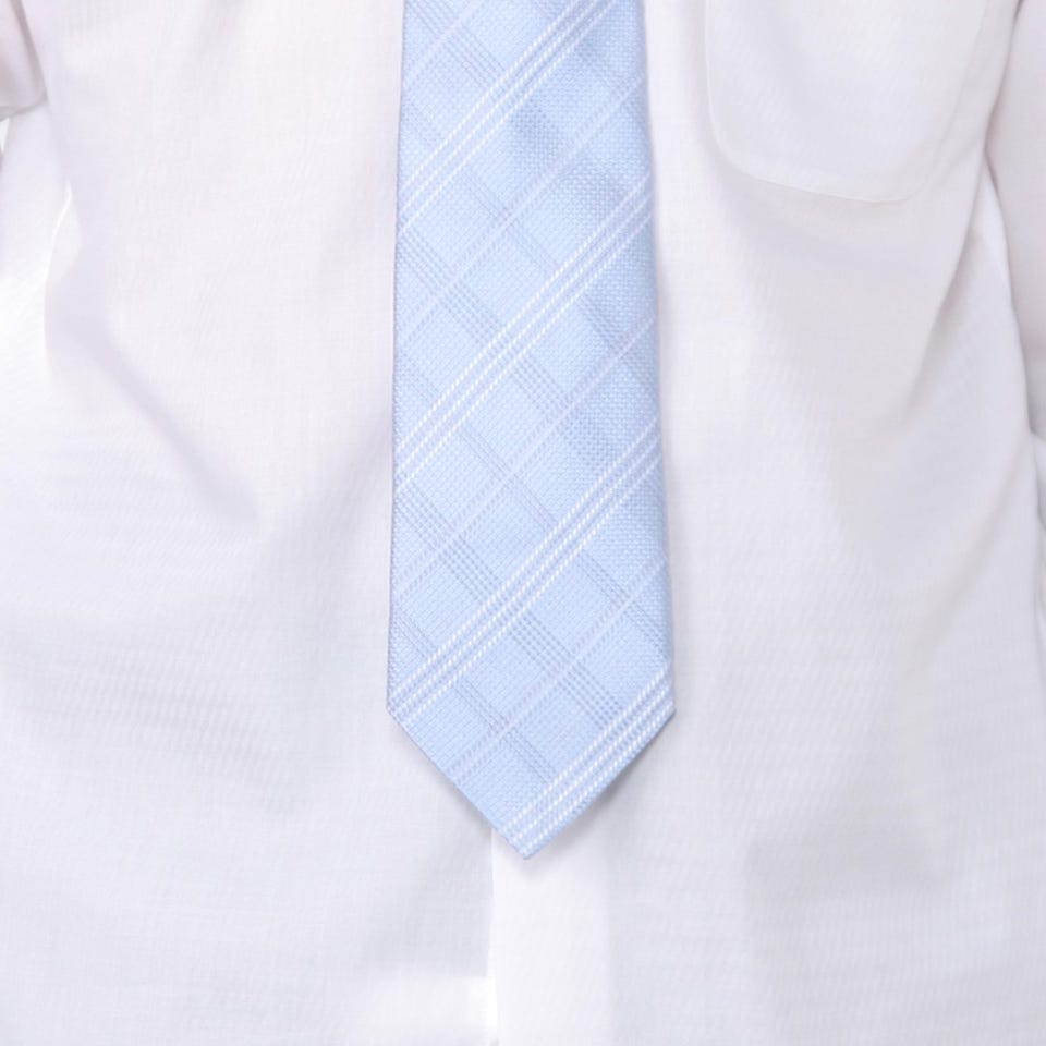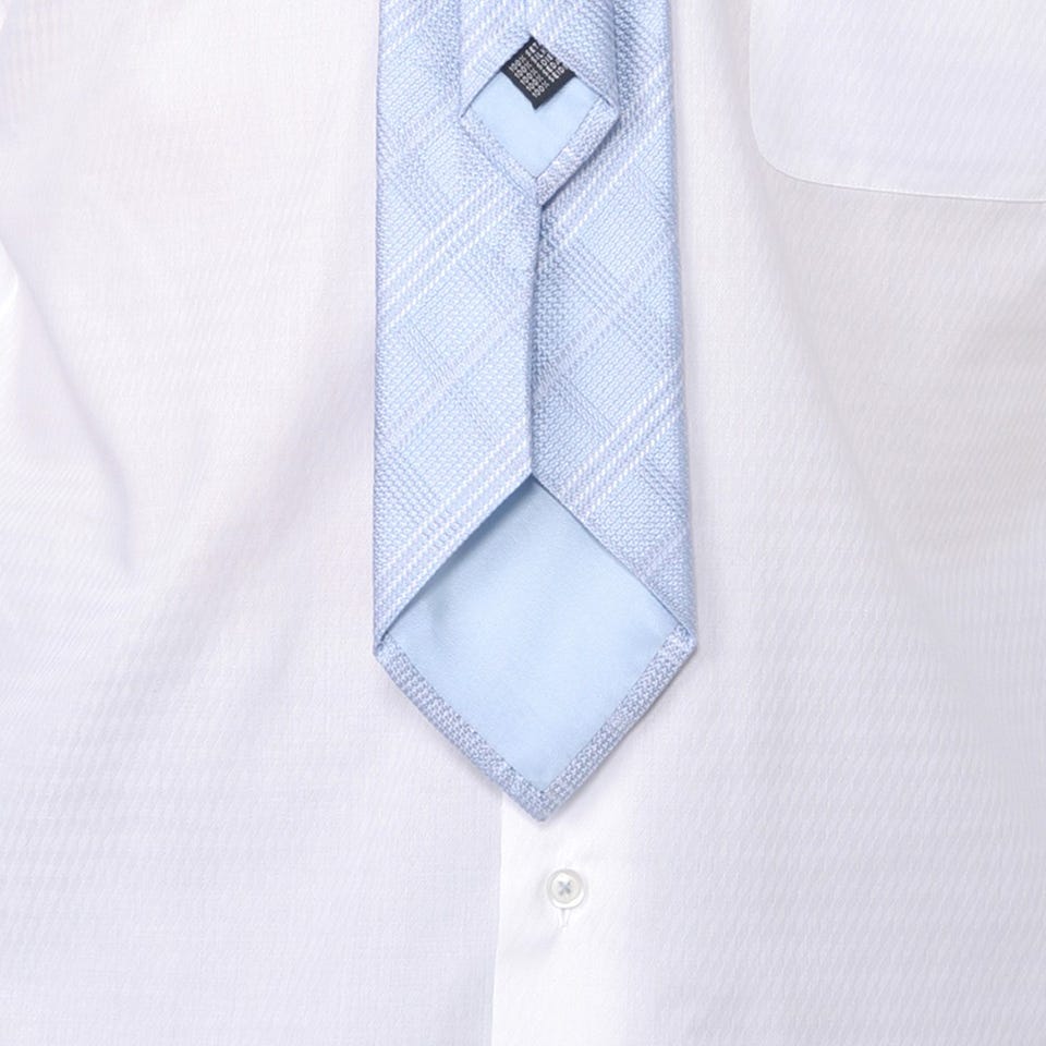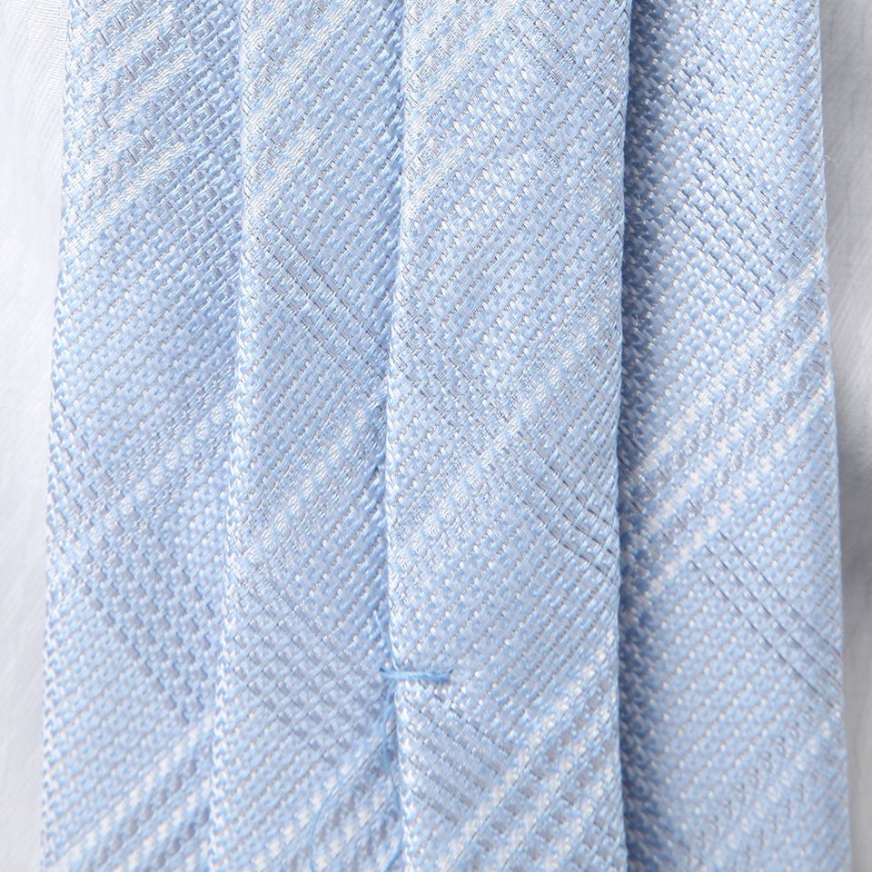 上品な光沢感のあるシルクを使用したネクタイ。凹凸のある素材感が大人っぽい胸元を演出します。清潔感のあるホワイトのチェック柄と爽やかなサックスブルーの組み合わせが華やかでパーティーなどにもオススメ。カラーシャツにも合わせやすいデザインになっています。