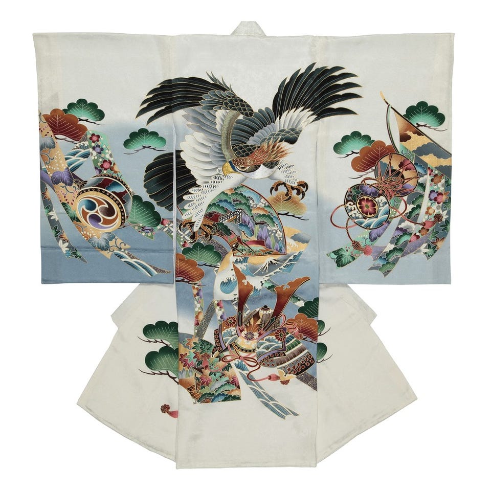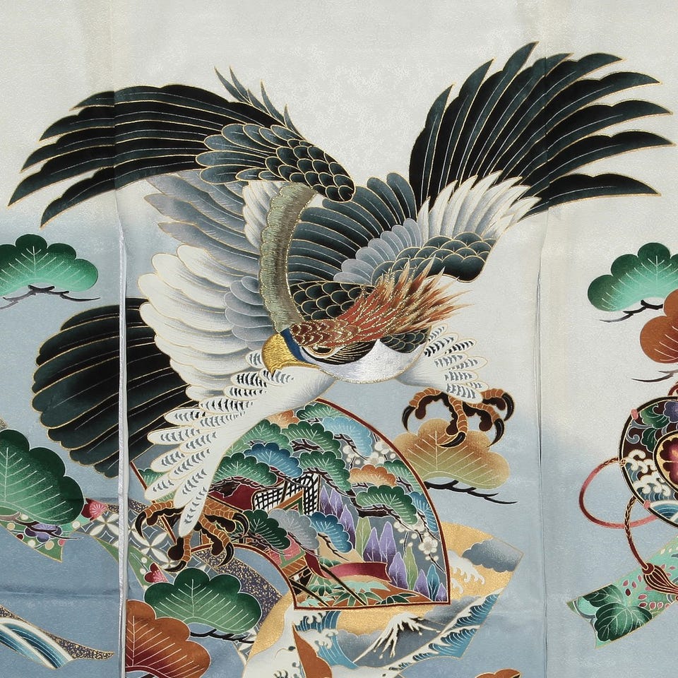 男の子 お宮参り 産着レンタル6点フルセット 正絹 鷹 金糸 ホワイト