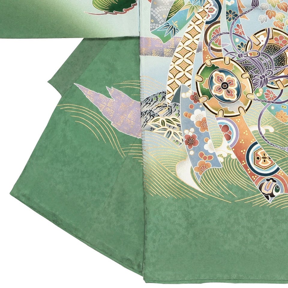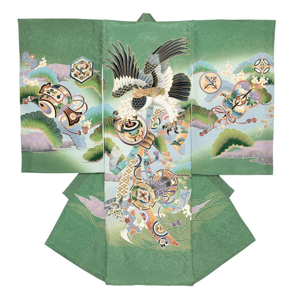 男の子 お宮参り 産着レンタル6点フルセット 正絹 鷹 団扇 グリーン