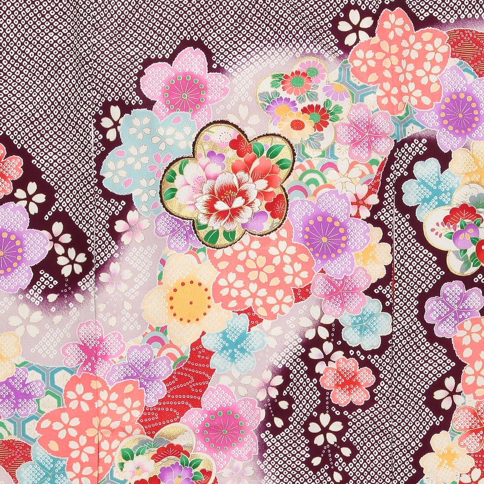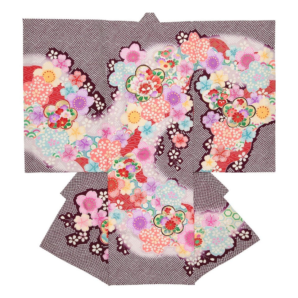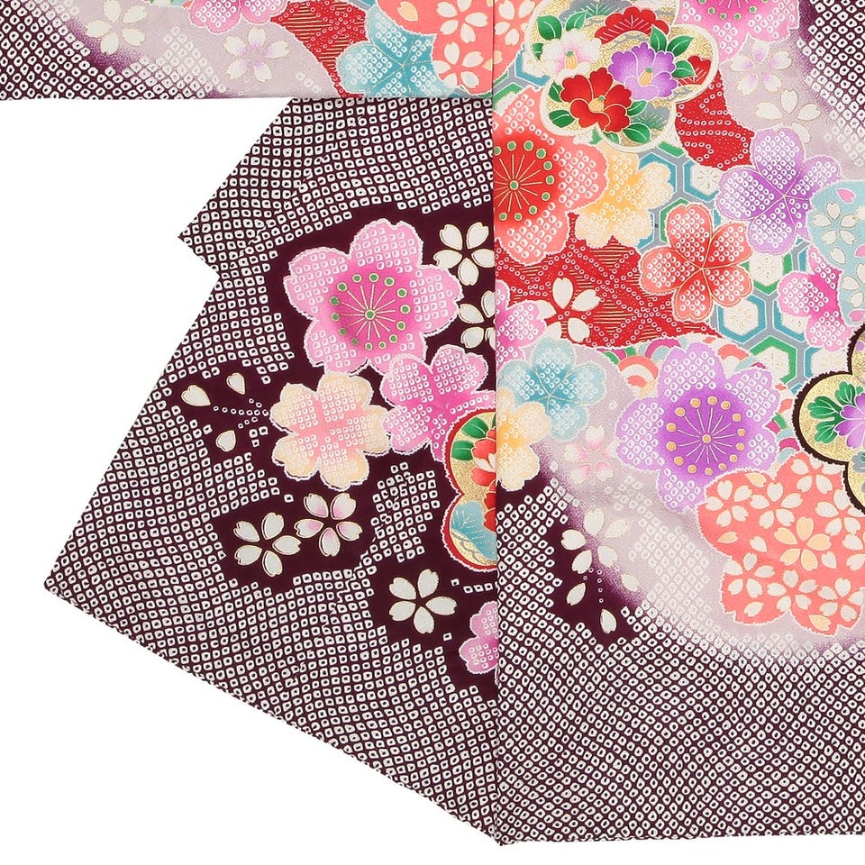 大小さまざまな花が咲き乱れるお宮参り用の着物です。パープルを基調とした鹿の子絞りの紋様は上品な印象。刺しゅうのきらめきと金彩加工の輝きが落ち着きのある配色に華やぎを添えています。