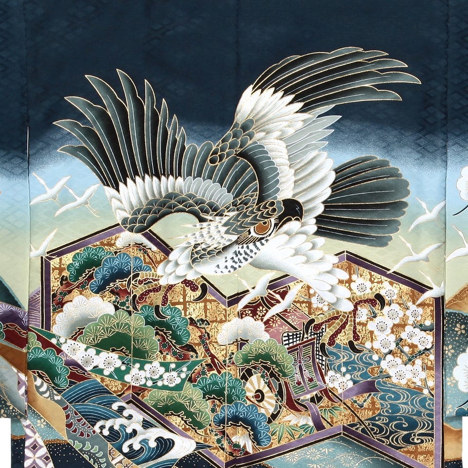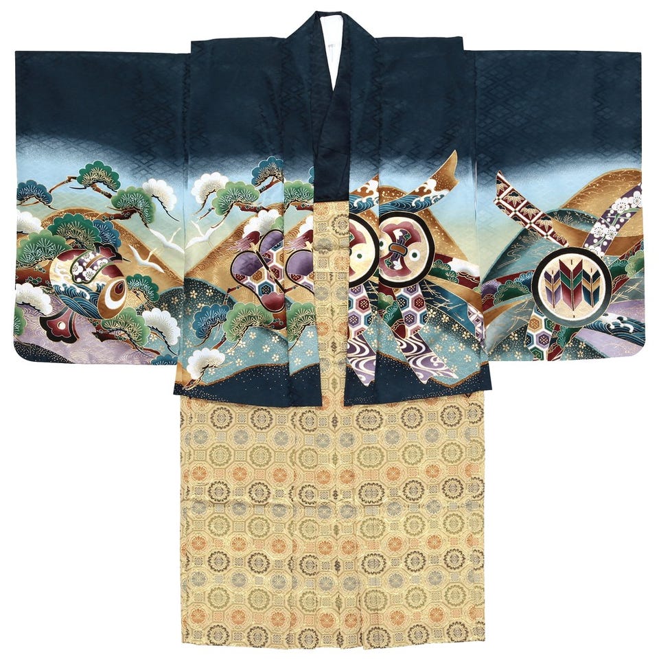 迫力満点な鷹を羽織の背中に描いた3才七五三用の羽織袴セットです。落ち着きのある地色のネイビーは品の良い印象。金色の地紋が美しい袴と小物を揃えて、絢爛豪華なイメージにまとめました。