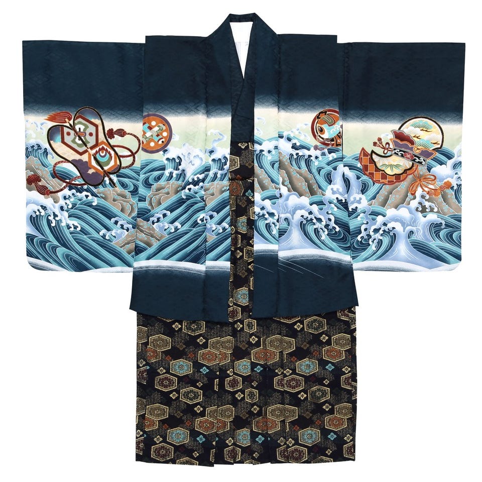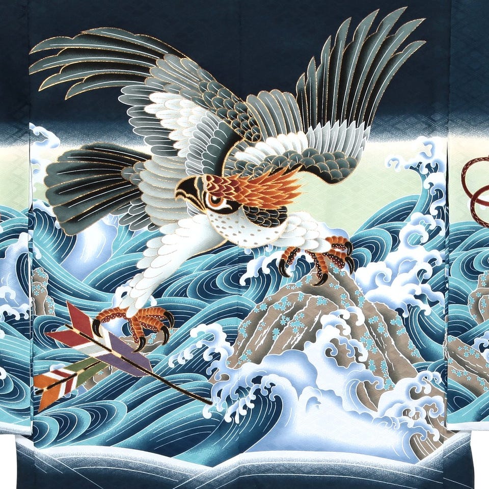 躍動感溢れる鷹が目を引く、3才七五三用の羽織袴セット。荒ぶる波の文様に弓矢や小槌など縁起物をちりばめました。金彩加工によるきらびやかな輝きも魅力。幼い思い出に華やかな彩りを添えてくれることでしょう。