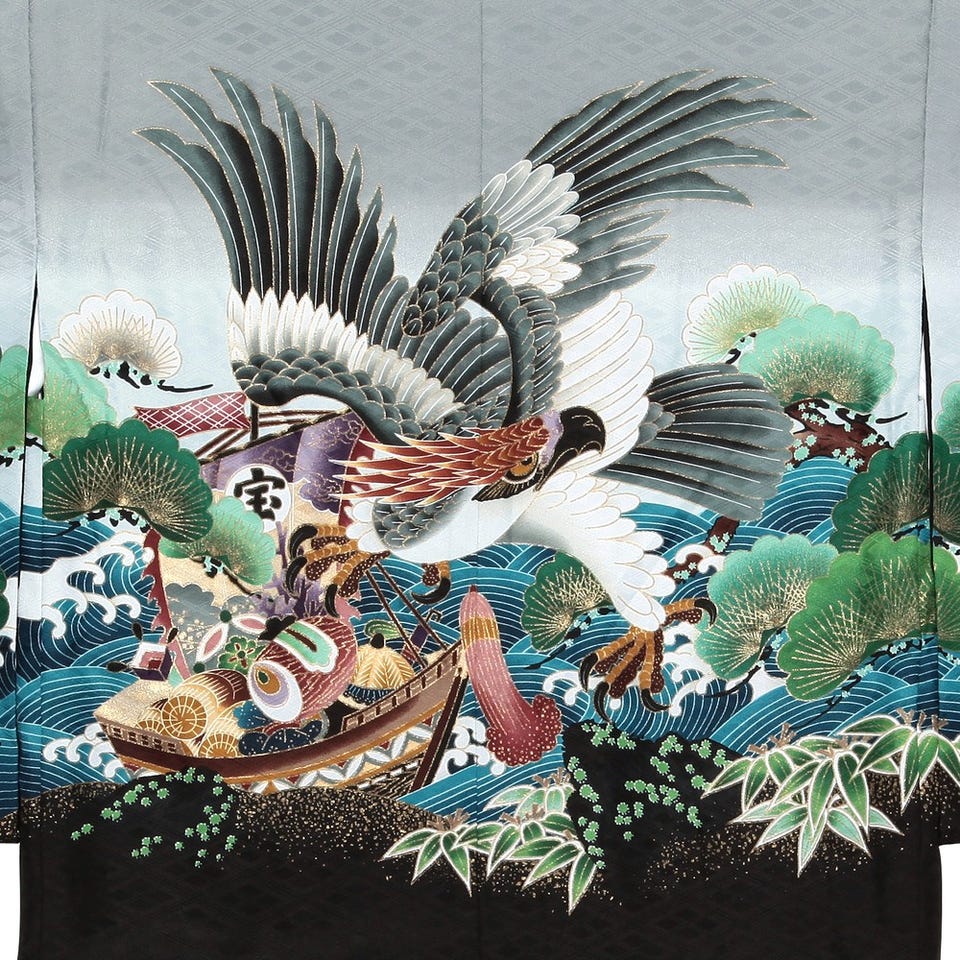 羽織の背中に凛々しい鷹が大きく描かれた3才七五三用の羽織袴セットです。宝船や矢羽、小槌など縁起物を随所に配しました。華やかな雰囲気を演出する金色の刺しゅうも見どころです。