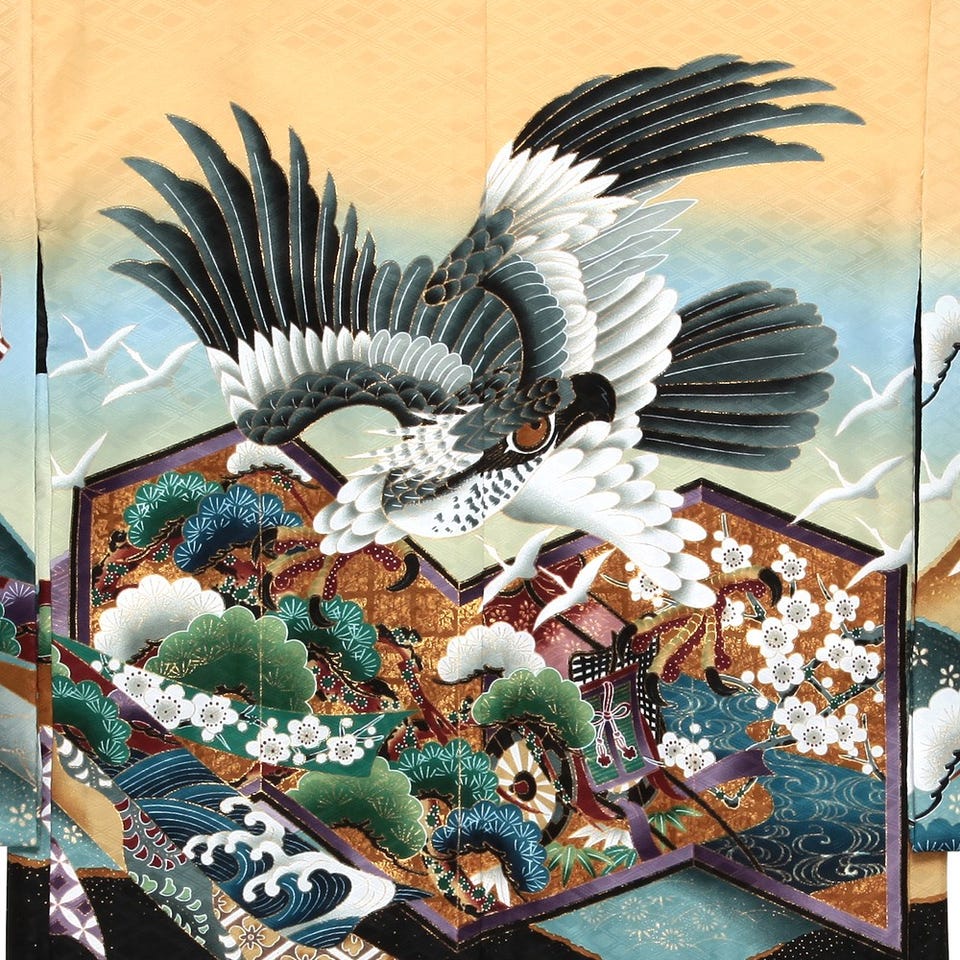 気迫のある鷹が羽織りの背中に大きく描かれた3才七五三用の羽織袴セットです。縁起の良い屏風や小槌の柄がお子様の門出をお祝いします。イエローを地色とした色鮮やかな配色も魅力的です。