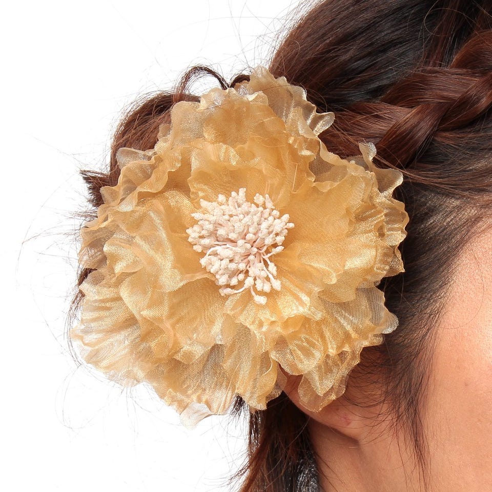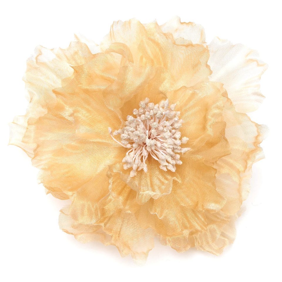 まるで生花のような、一枚一枚動きのあるニュアンスが繊細で美しいベージュコサージュ。中央にはキラキラと光る素材を使用。軽やかな印象でパーティ気分を盛り上げてくれます。