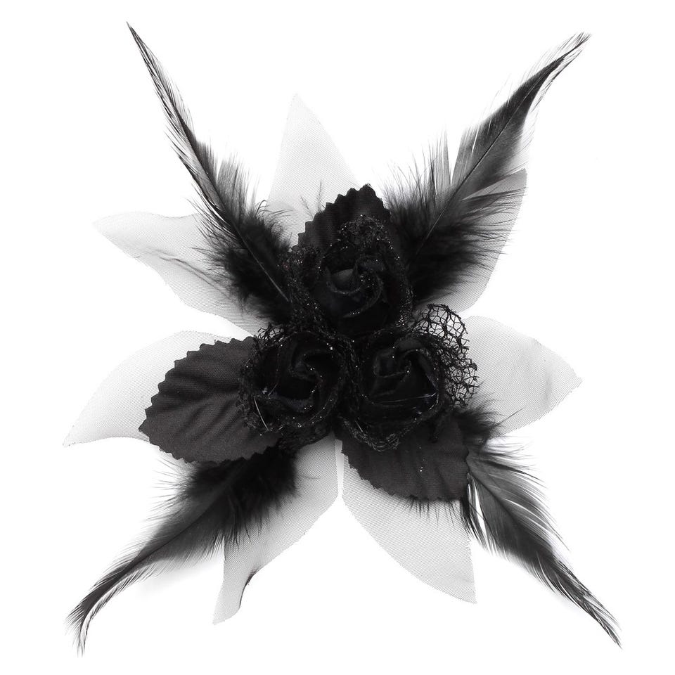フェザーとチュール、レース、ラメを贅沢に組み合わせたコサージュ。凝ったデザインをブラックでまとめあげ、センス良く仕上げています。華やかなシーンには少し思い切ってゴージャスな小物を取り入れて。
