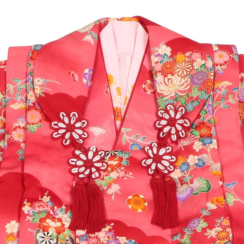 扇や花車というおもむきある古典的な柄を明るく、華やかに施しました。着物ならではの繊細な色付 けが随所にみられます。赤のボカシ模様が優雅な雰囲気作りを手助けしてくれます。こちらの商品には髪飾りが付属しておりませんので、希望される際は被布セットと合わせて「髪飾り」をご注文下さい。