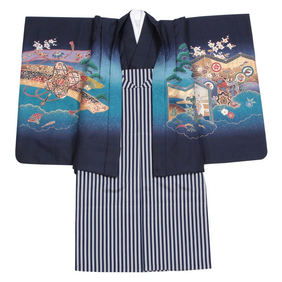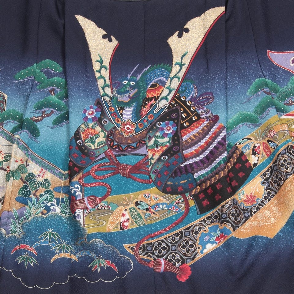 優雅な雰囲気を醸し出す、鮮やかな色彩で彩られたお着物です。鶴や花があしらわれた屏風柄や、独特な色とデザインのカブト、と様々な要素が詰まった意匠が特徴。特別な一日に最適です。