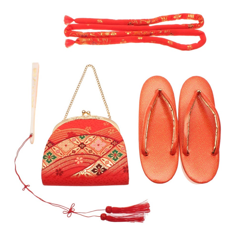 ■着物セット・着物・帯・長襦袢(半衿つき)・帯揚・兵児帯(しごき)・腰ひも4本・伊達締め・足袋・肌襦袢・三重紐・裾除け■箱迫セット・帯締め・御びら簪・バッグ・草履・箱せこ・扇子