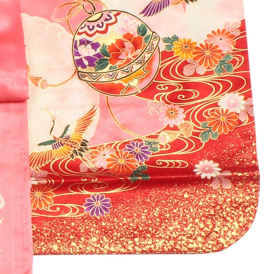 光沢のあるピンクの着物と、鮮やかな帯のコントラストが抜群です。鈴、波頭、飛び鶴の装飾はうっとりしてしまうほど美しく仕上げました。所々に金彩が配されているのも魅力です。
