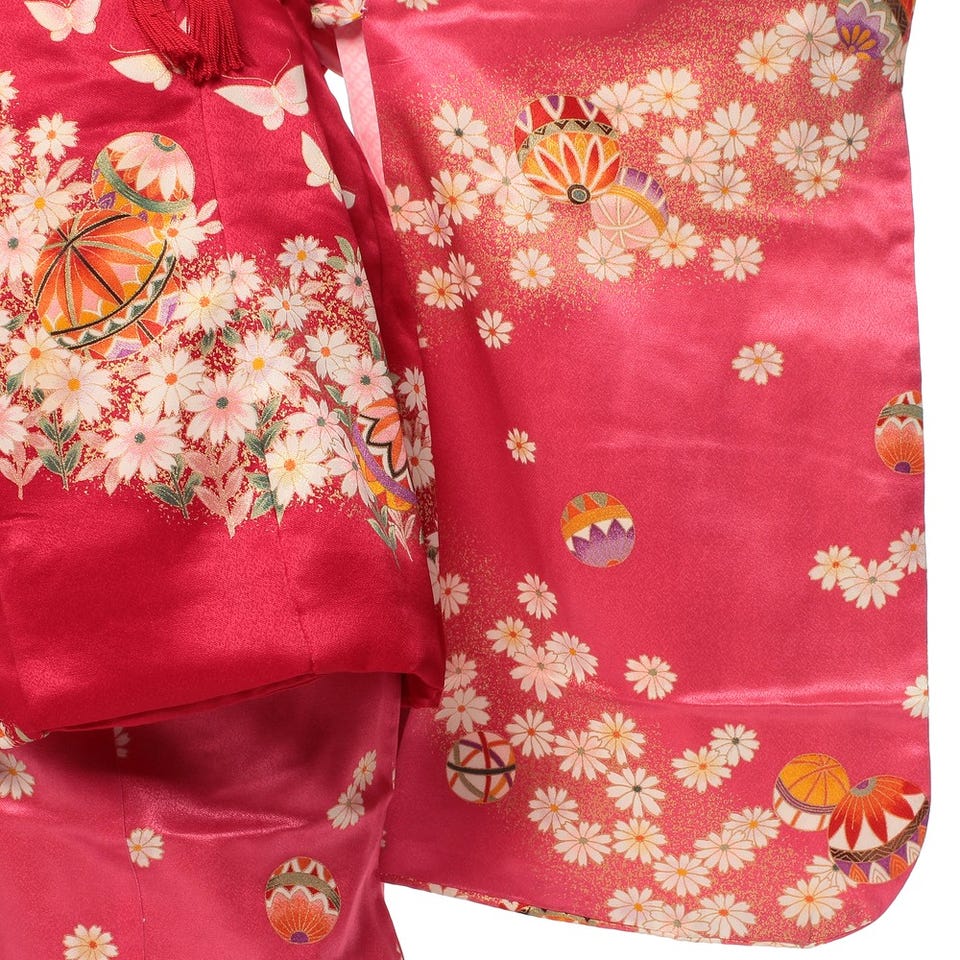 ピンク×ホワイトのカラーバランスが絶妙で、光沢感のある生地は全体を明るく魅せてくれます。しっとりと上品な雰囲気が魅力的。ランダムに配された手毬のデザインにも注目です。