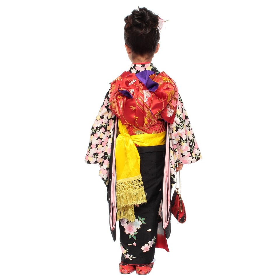 沢山の花柄で可憐に彩られたブラックのお着物。パープルが入った赤い帯が全体を引きしめ、上品に纏め上げます。しっとりとした佇まいが女性らしさを感じさせ、お子様の成長をお祝いします。