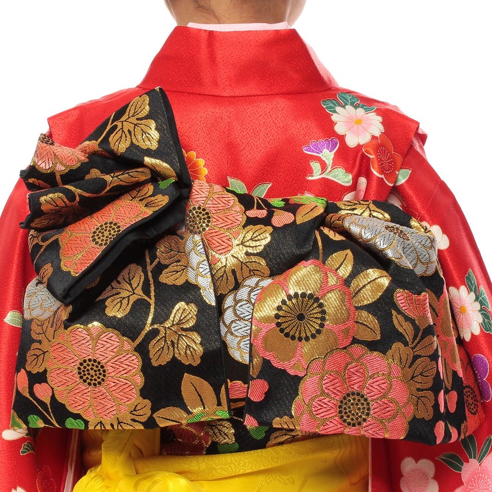 ツヤ感がより華やかさを演出してくれるお着物。生地に負けない鮮やかなカラーの花柄がチャームポイントです。シックな柄が施されたブラックの帯が、大人顔負けの艶やかさを演出してくれます。