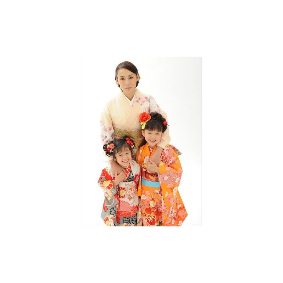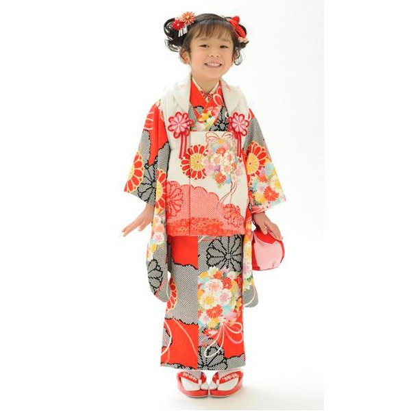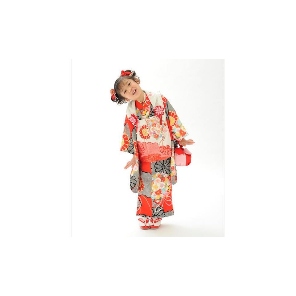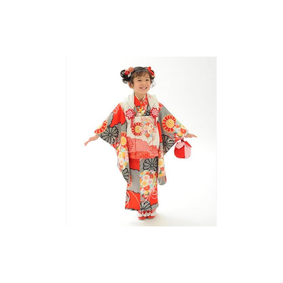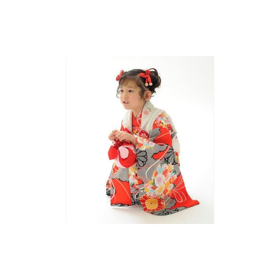 正統派の赤い着物に、黒の疋田柄をポイントにしました。古典柄の菊に花手毬、白地の被布を合わせてかわいらしさを演出した一品です。