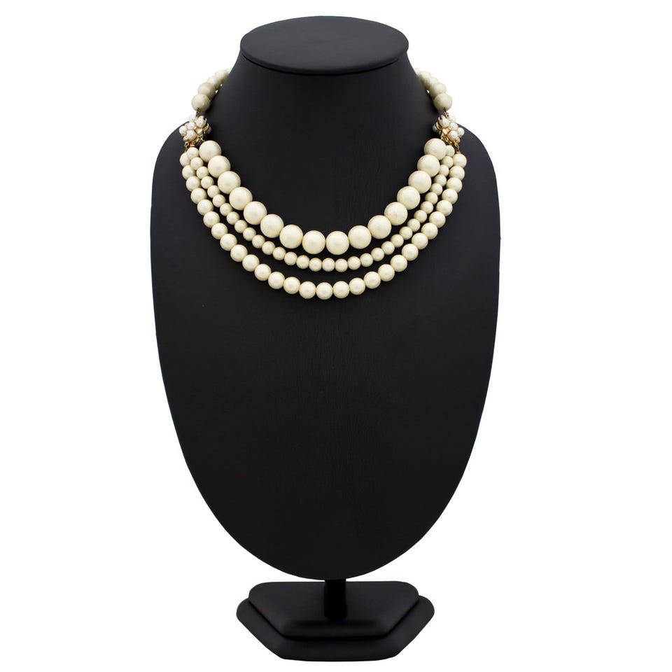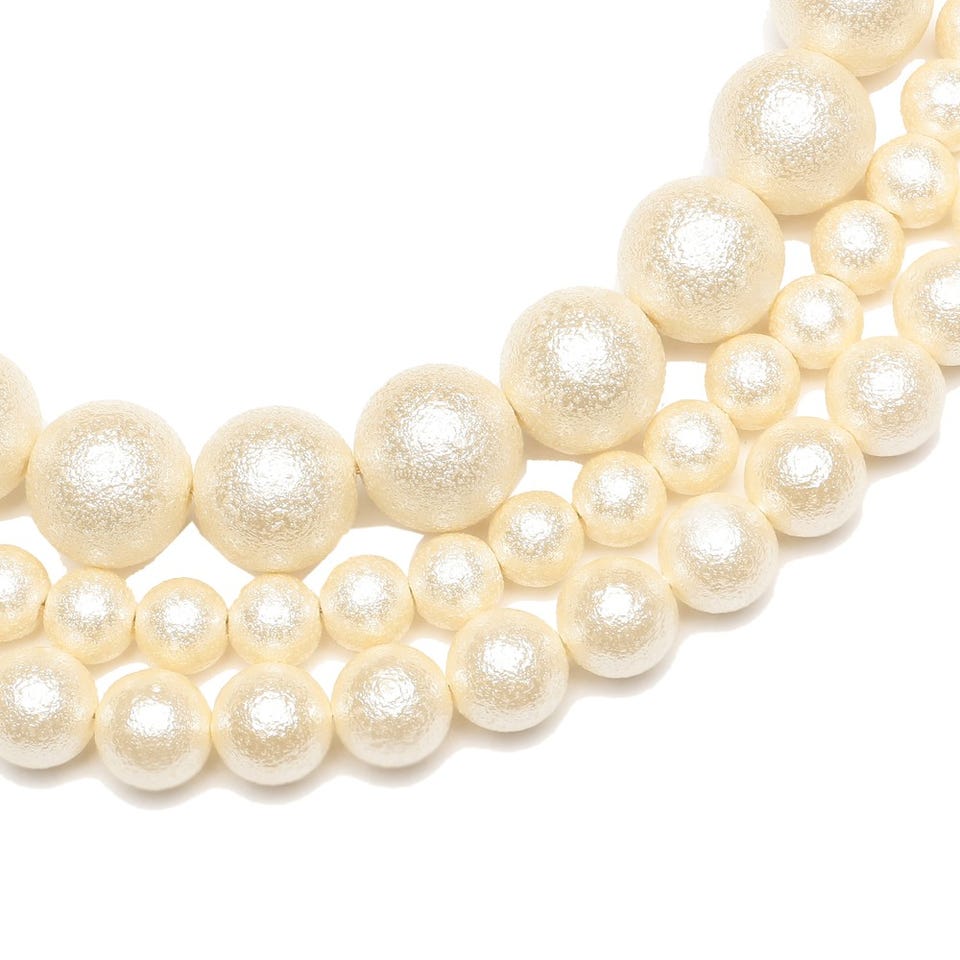スタイルのアクセントに最適なコットンパールのネックレス。大小異なるコットンパールを3連にしボリュームあるデザインで仕上げました。パーティシーンをより華やかにしてくれるオシャレな1品。