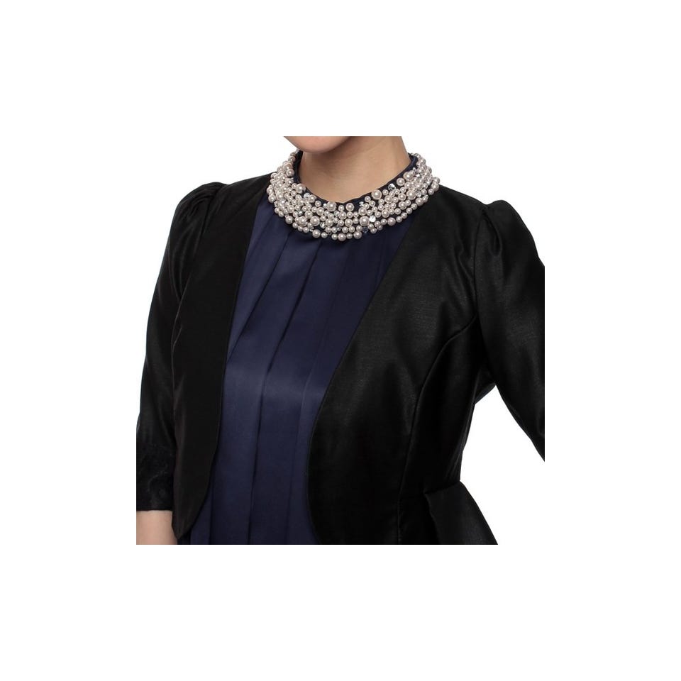 ジャケットのようなきちんと感のあるボレロ。フロントに入ったダーツや裾の切り替え、後ろが長めになったヘムラインとディテールにこだわりが光ります。パーティからフォーマルなシーンまで活躍する1着です。