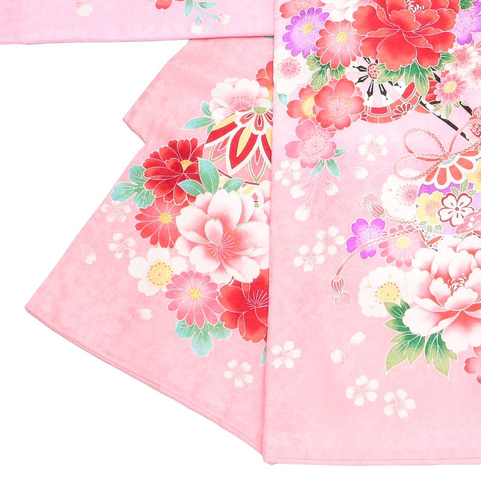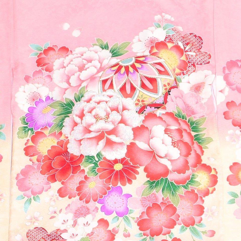 美しい花柄や毬、鼓を全体に描いたお宮参り用の着物です。鮮やかなカラーリングで目を引くルックスに仕上がりました。お子様の表情まで明るしてくれる華やかなアイテムです。