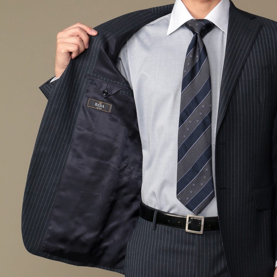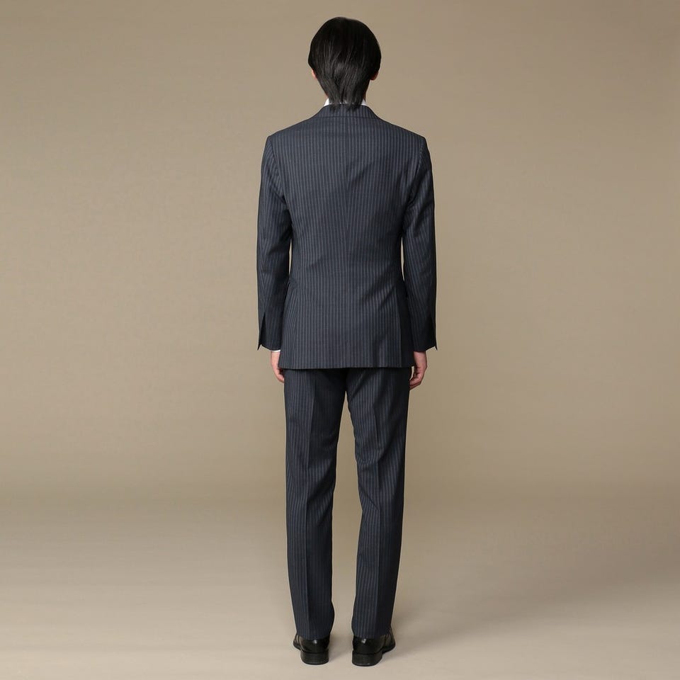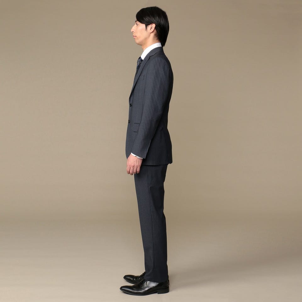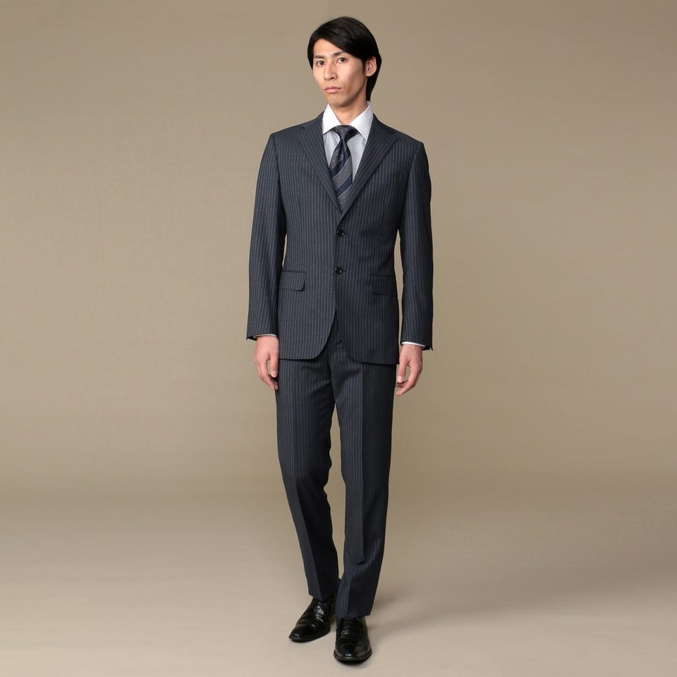 さまざまなシーンで活躍するネイビーのストライプ柄スーツ。スマートなオシャレを楽しむのが王道スタイルです。