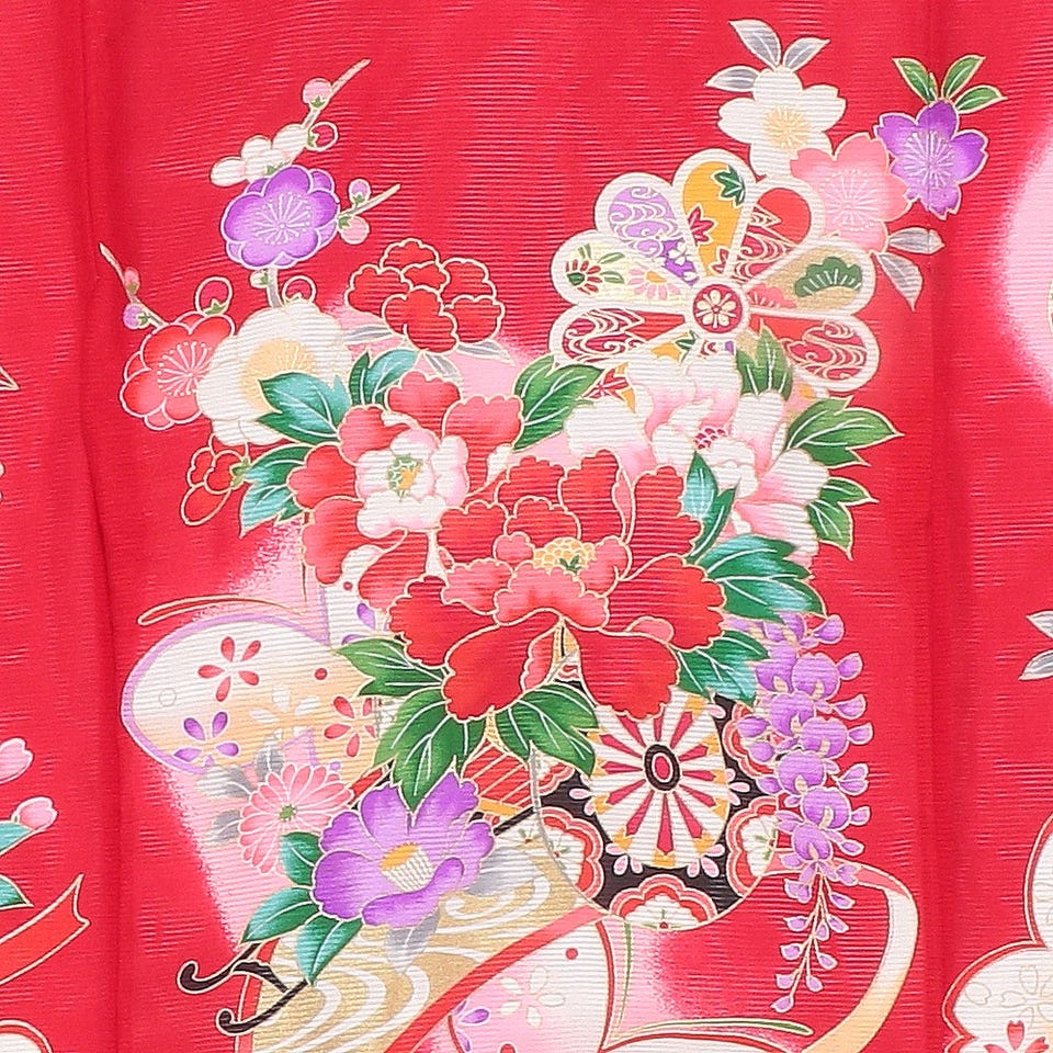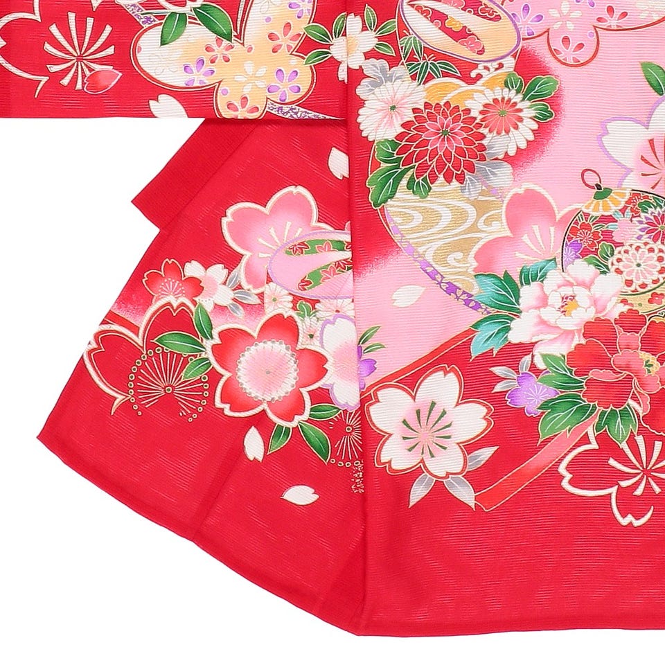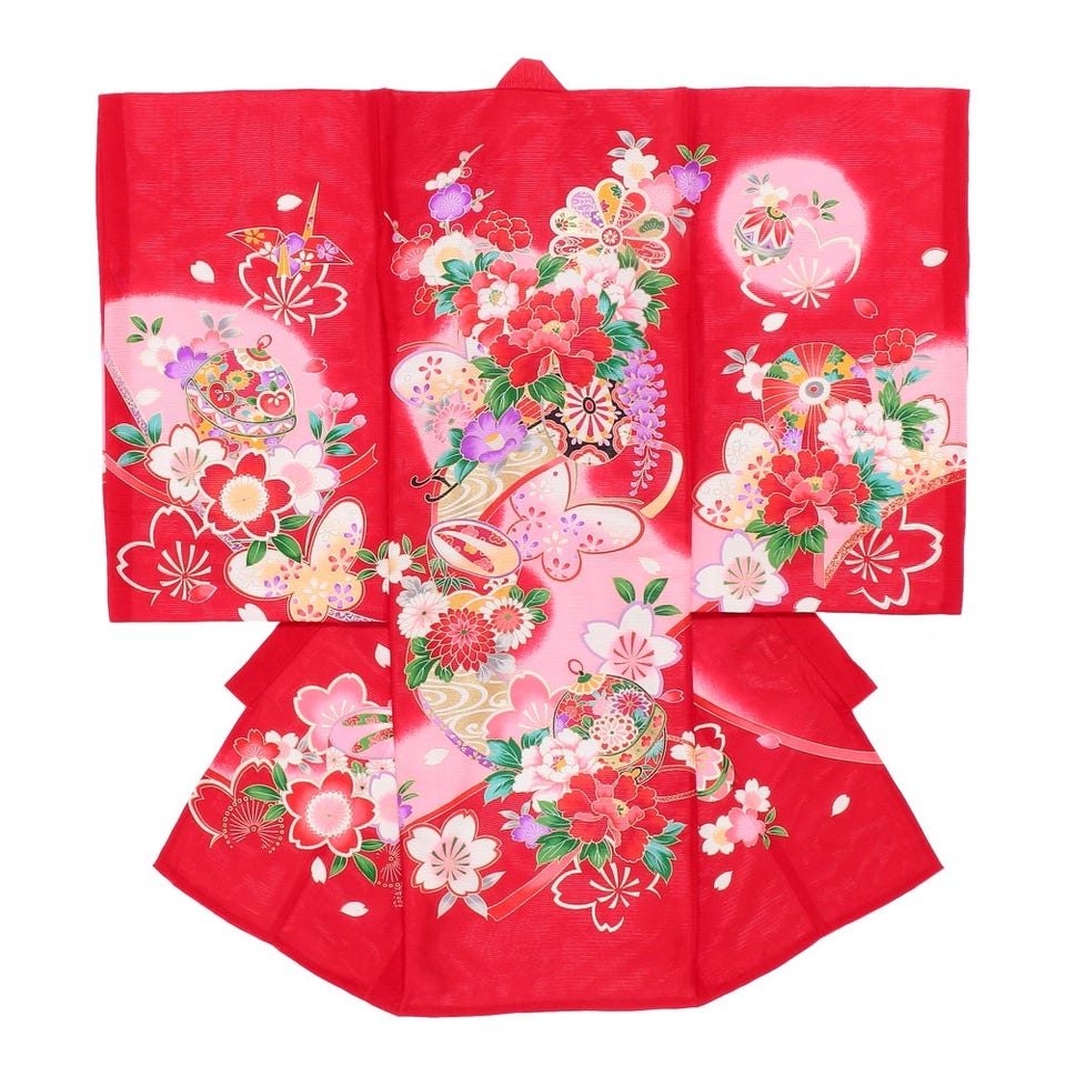 目を奪われるような細かいタッチで描かれたお宮参り用の着物です。ベースには女の子にぴったりなレッドカラーを採用しました。「邪気を追い払い、神に呼びかけ祈りや願いを届ける」鈴や「まるまると健やかに愛らしく、誰にも好かれる良い子になるように」と願いが込められた毛毬の入っている華やかな花柄です。