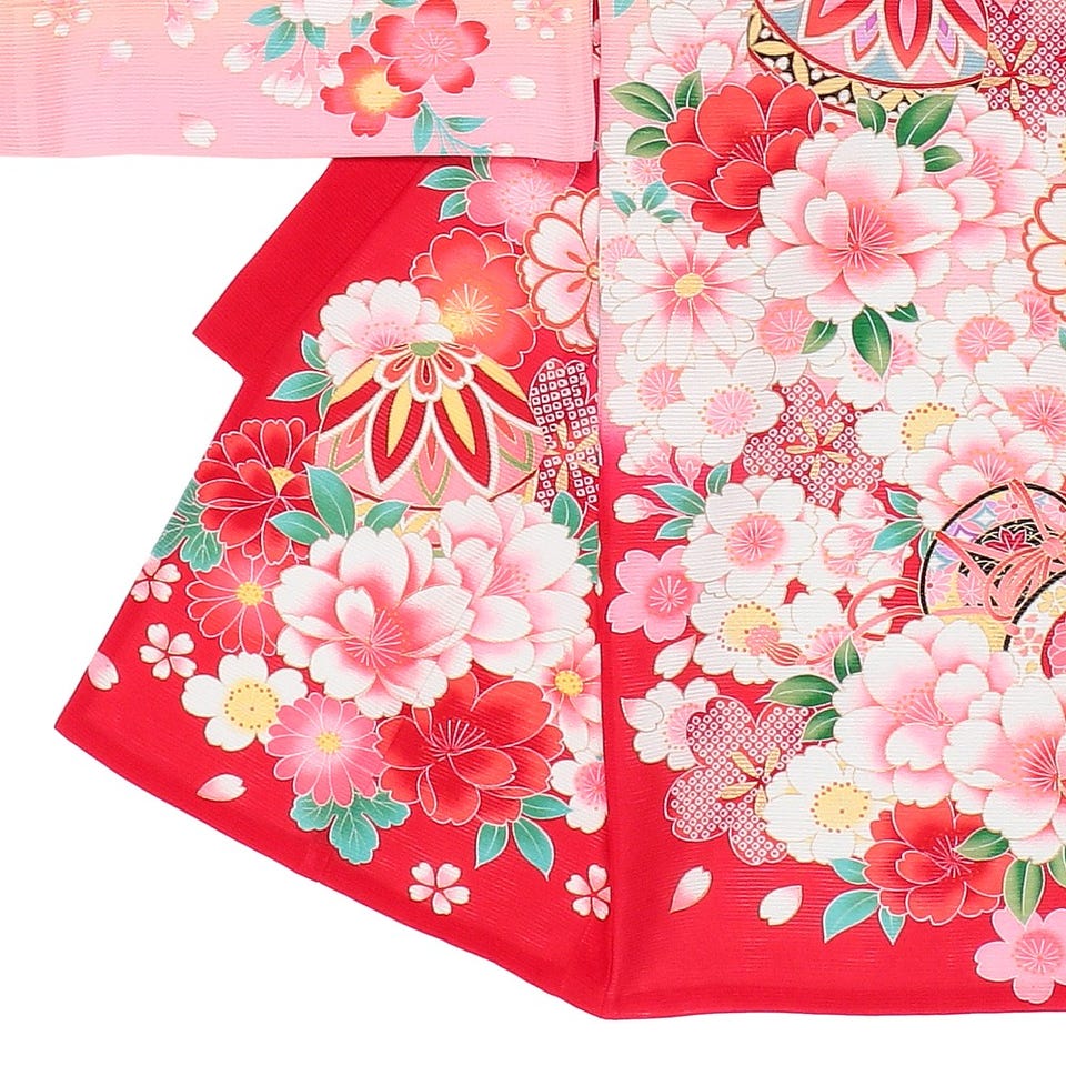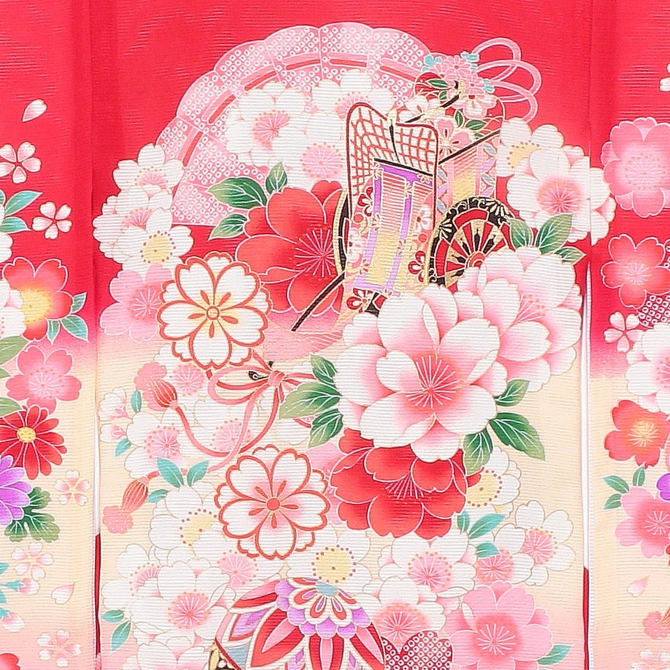 高貴な人が乗る御所車と鮮やかな色合いで描かれた花柄が目を引くお宮参り用の着物です。写真栄えするデザインですので、お子様の成長を収めるアルバムの1ページをパッと華やかに仕上げてくれることでしょう。