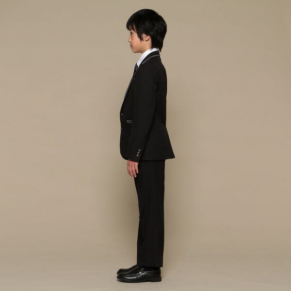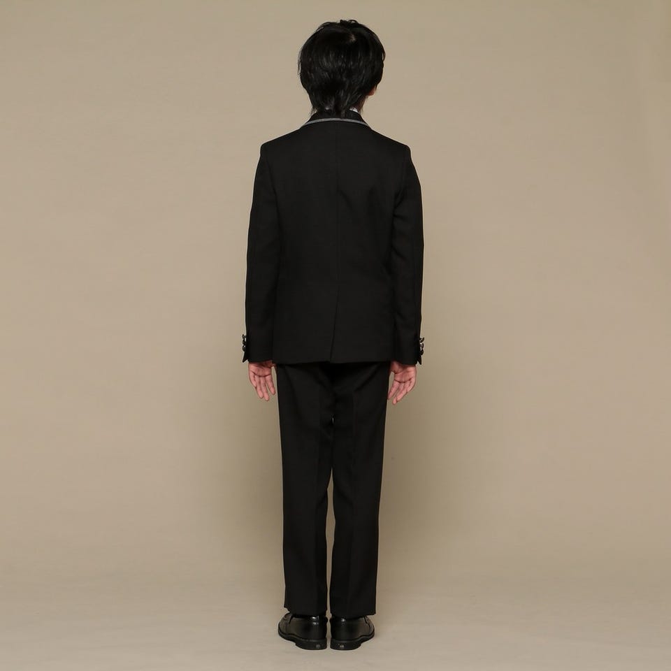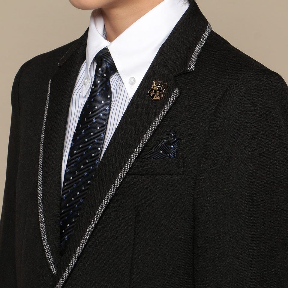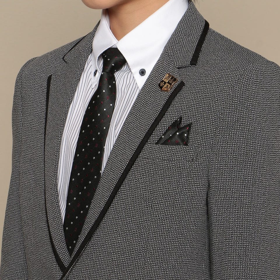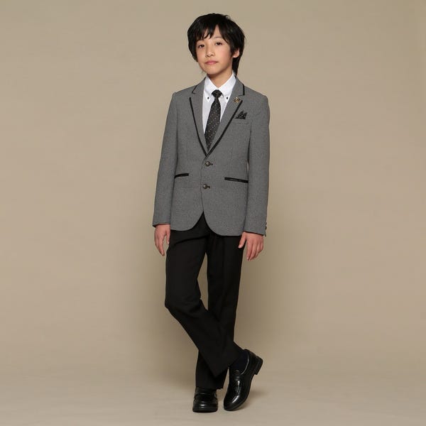 ジャケットパンツスタイルのおしゃれなスーツ。クレリックシャツやラペルに付いたバッヂがアクセント。ドット柄のネクタイとポケットチーフで個性をプラスしています。パーティーや卒業式におすすめのクールで都会的なセットです。