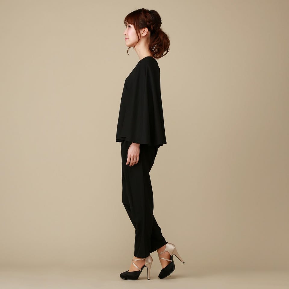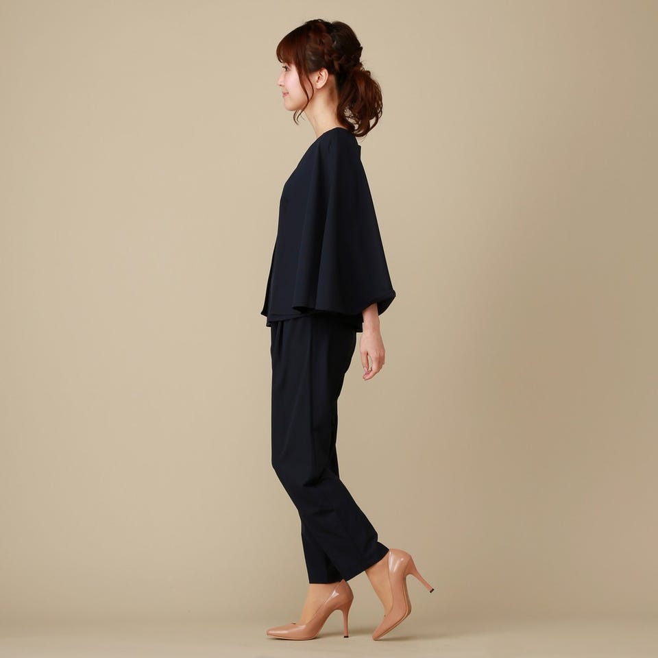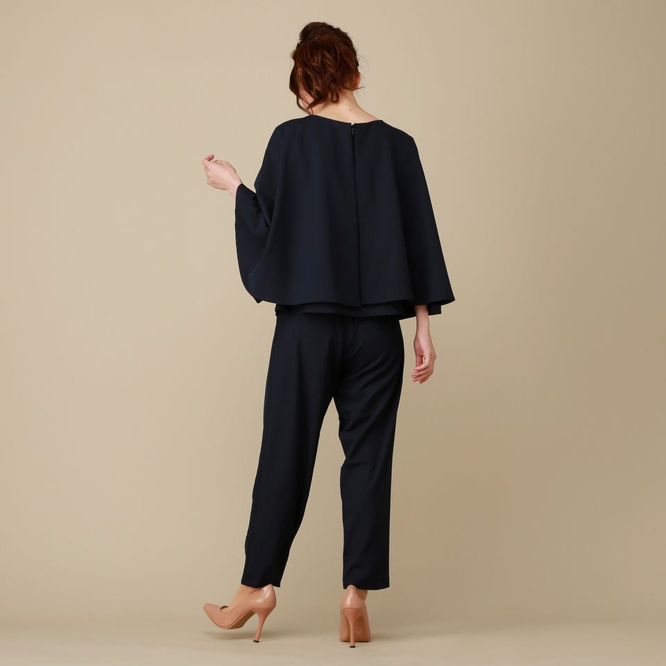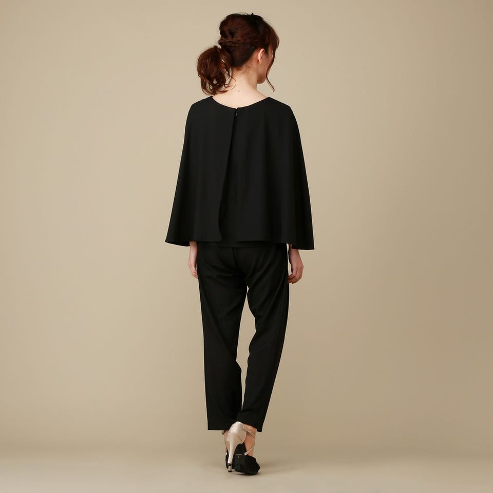 エレガントな雰囲気を演出するケープ付きブラウスとテーパードパンツのセットです。動く度にしなやかに揺れるケープがポイント。素材にポリウレタンを含ませ、ストレッチを効かせたので着心地も快適です。