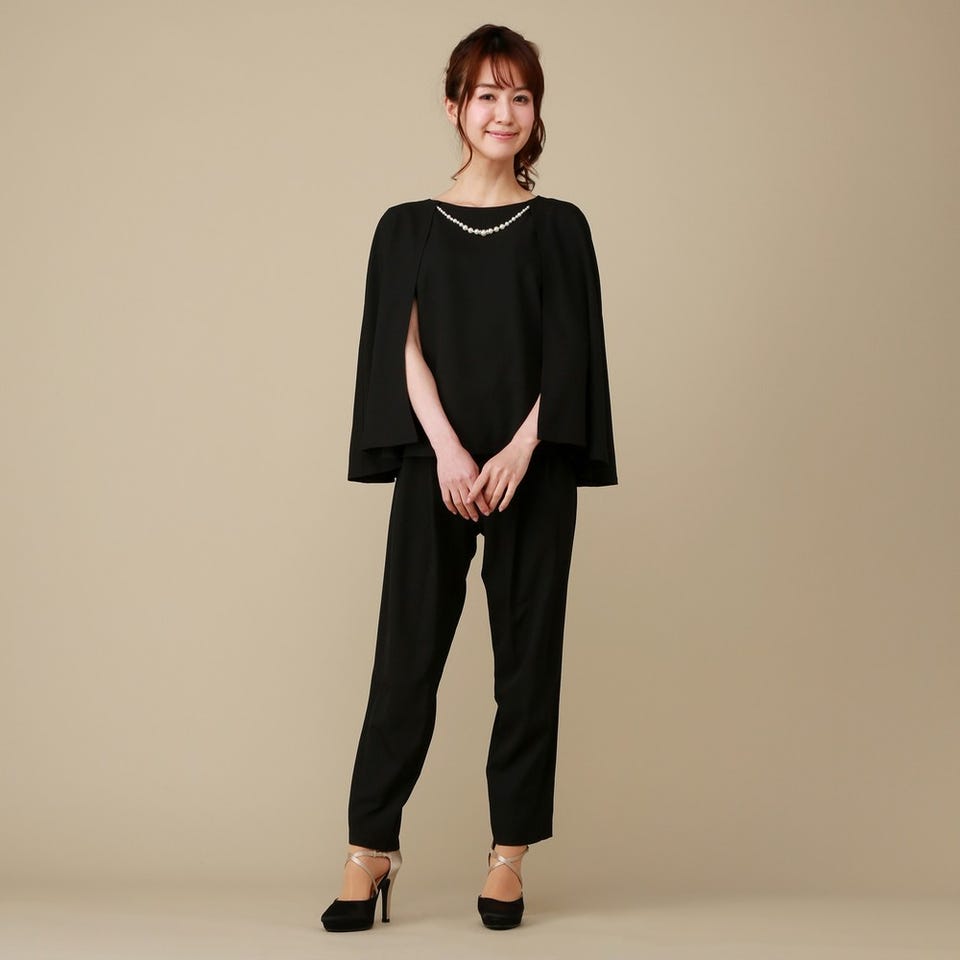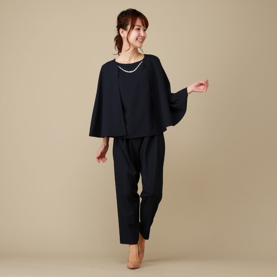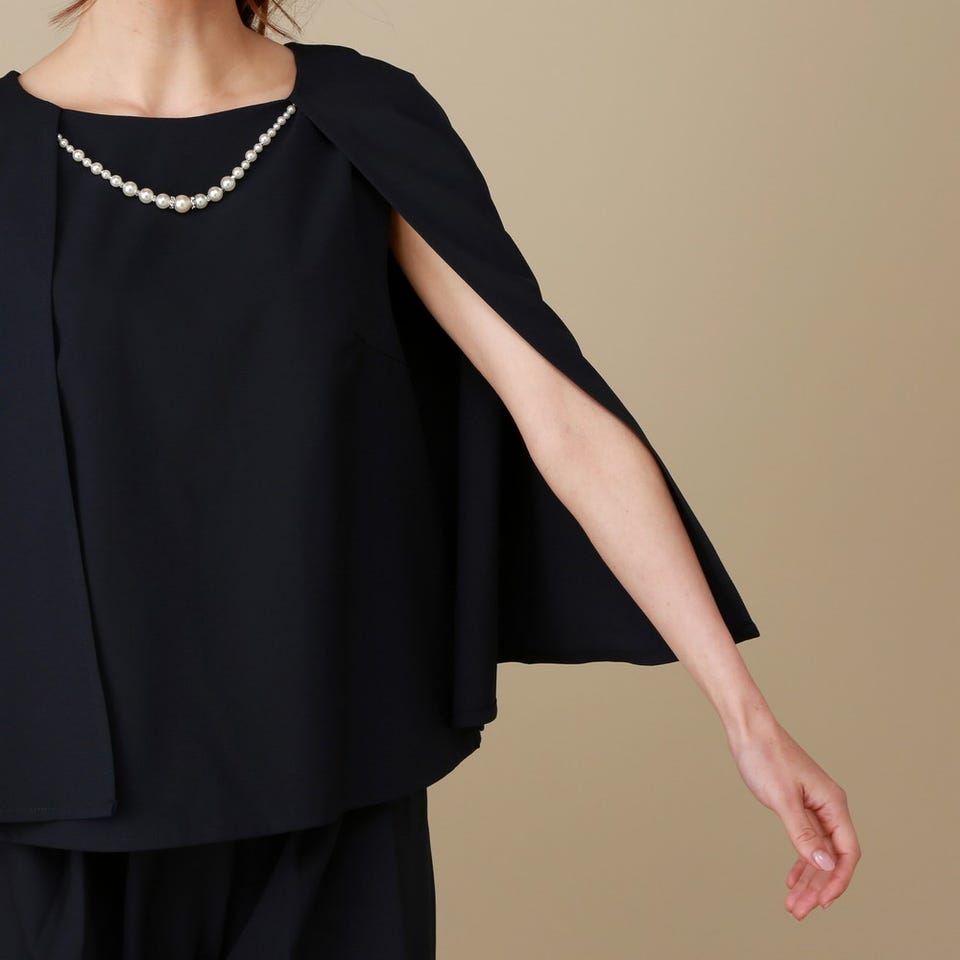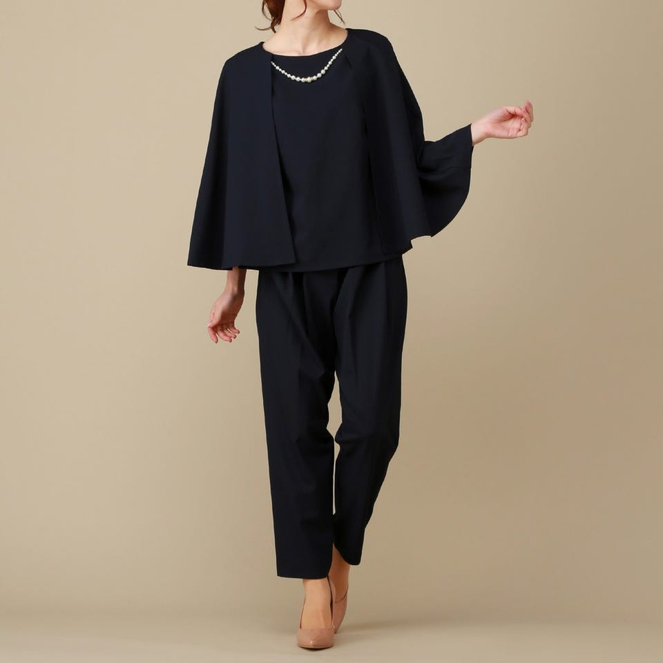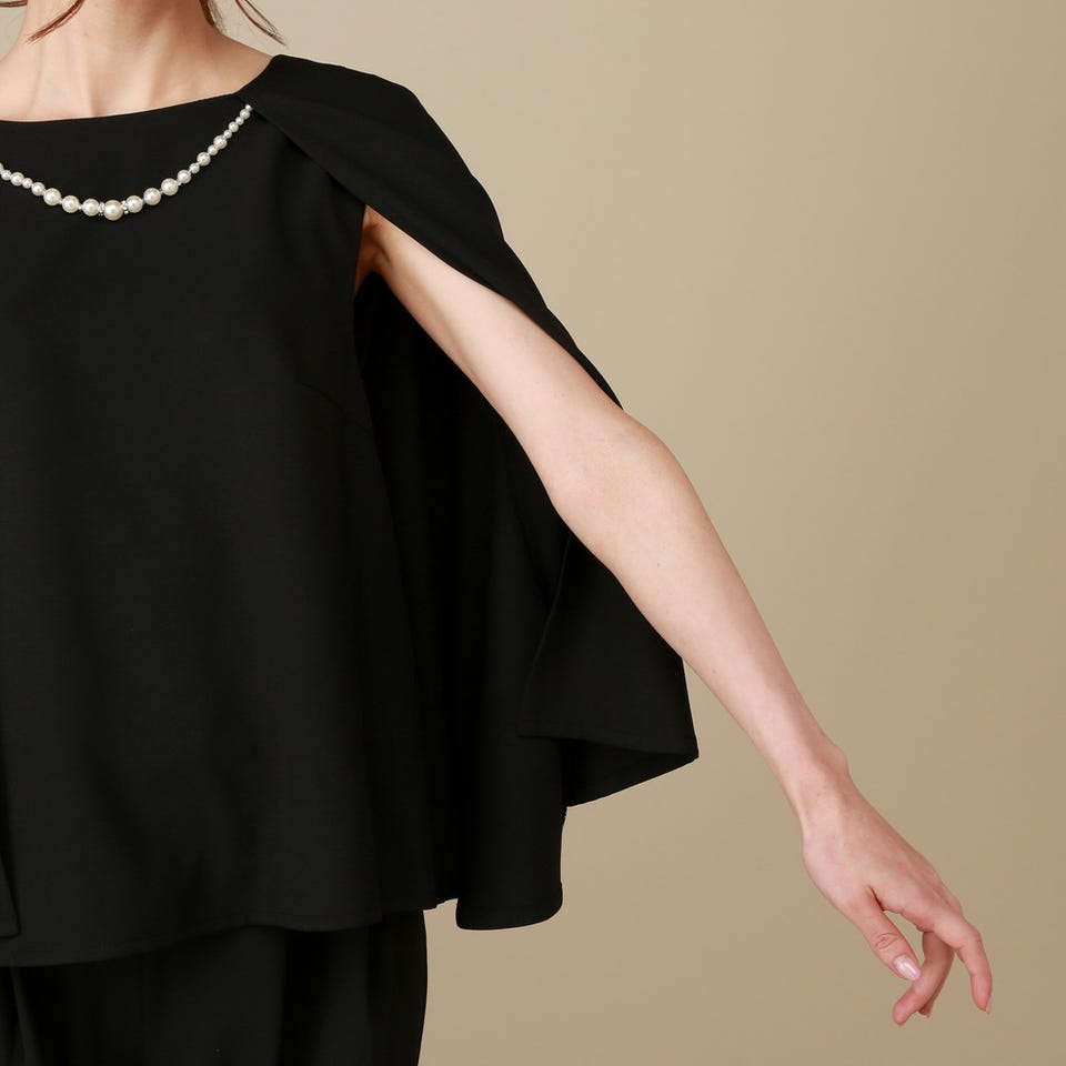 エレガントな雰囲気を演出するケープ付きブラウスとテーパードパンツのセットです。動く度にしなやかに揺れるケープがポイント。素材にポリウレタンを含ませ、ストレッチを効かせたので着心地も快適です。