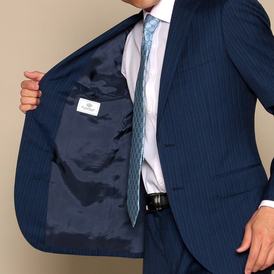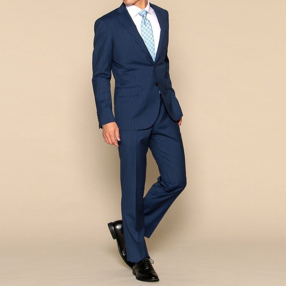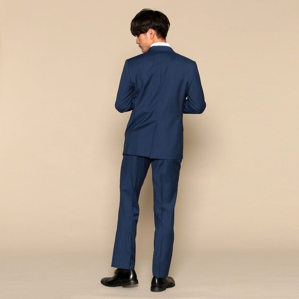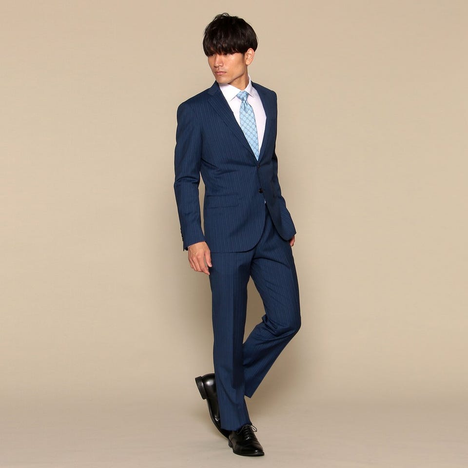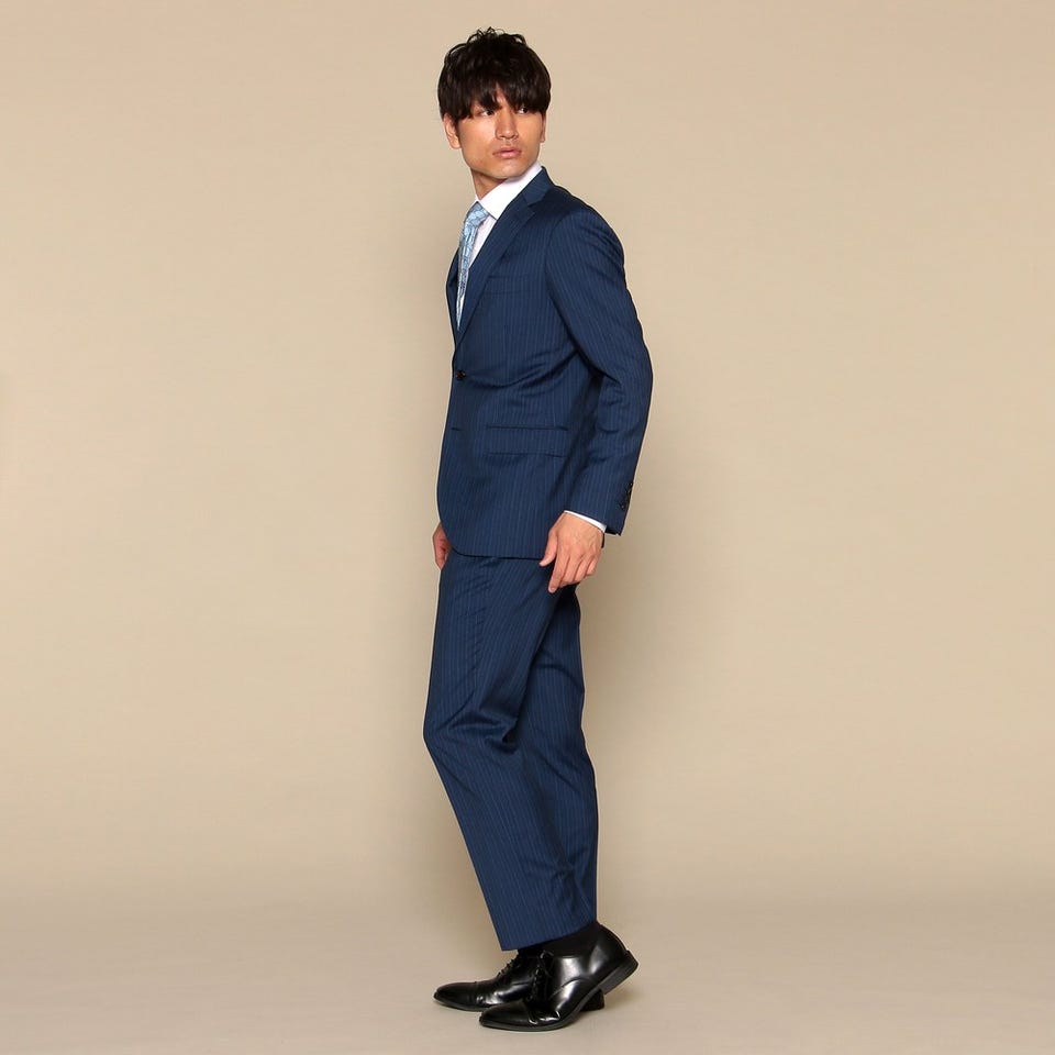 爽やかさを印象付けるネイビーのストライプスーツのセットです。