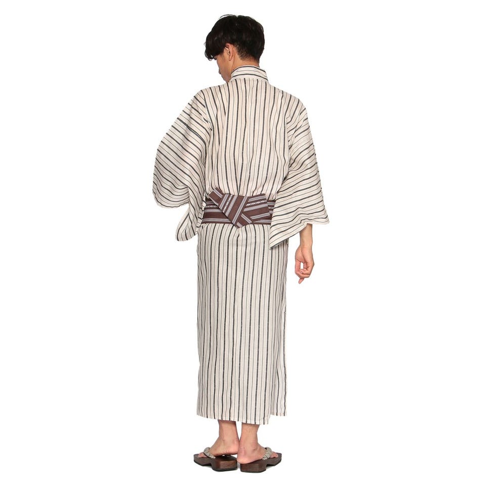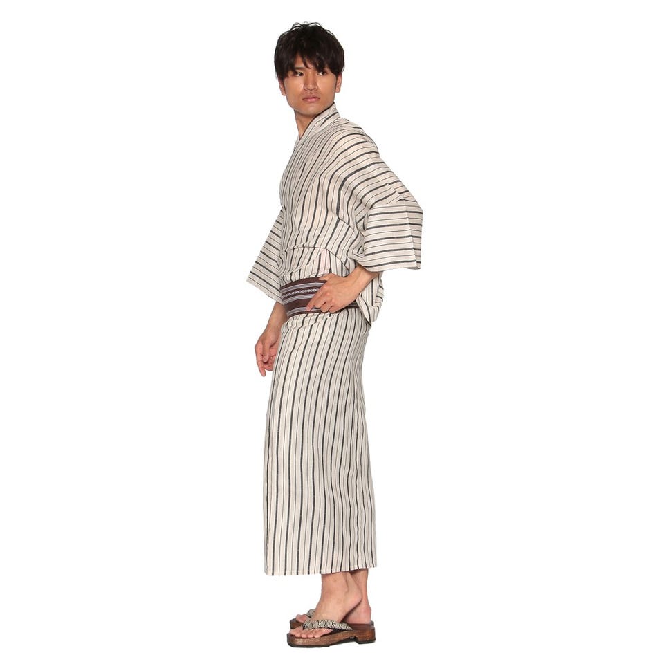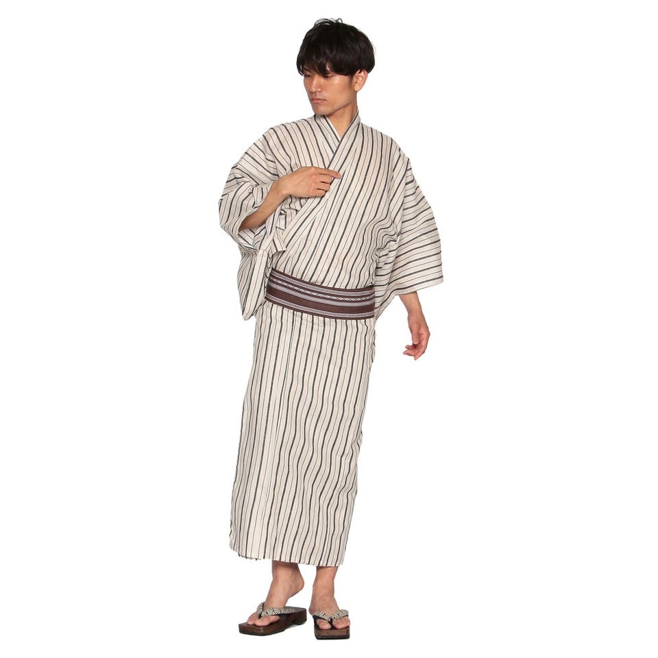 太さの異なる縞が交互に入った浴衣のセット。爽やかなカラーが暑い日に涼しさを演出してくれます。帯は面ファスナーで簡単に着脱可能。下駄は鼻緒の柄が異なる場合がございます。※写真はイメージです。付属されている帯の色と異なる可能性がございます。あらかじめご了承ください。