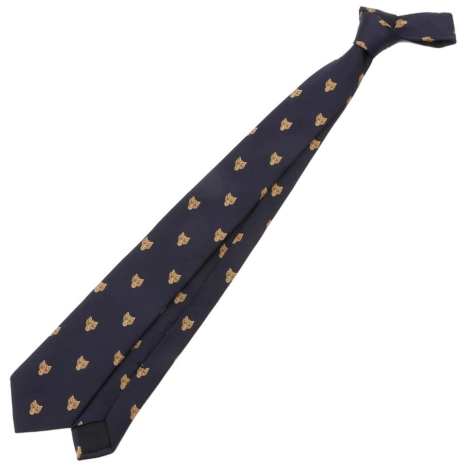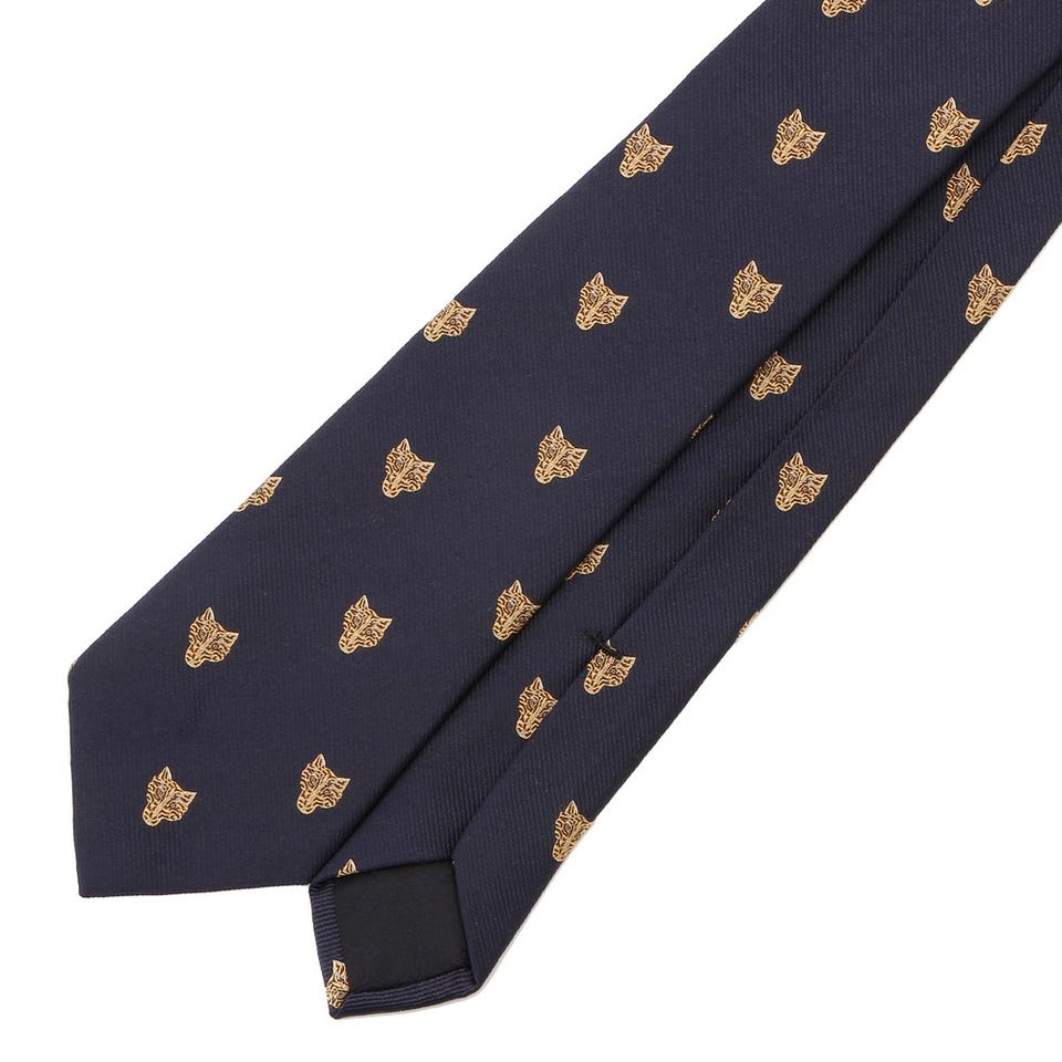 虎の顔があしらわれた、独特の雰囲気を醸すネクタイです。ベースカラーには落ち着いたネイビーを採用しているので、様々なスーツと好相性。首元のアクセントに是非お使いください。