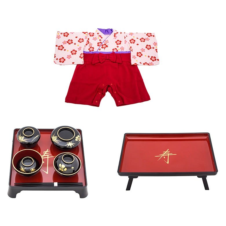 ・女の子用 お食い初め初膳 食器セット(お膳、飯椀、汁椀、つぼ椀、平椀、お箸)・男女共通 お食い初め二の膳(お頭付き鯛や季節のお菓子などの飾り台)・女の子用 ベビー袴