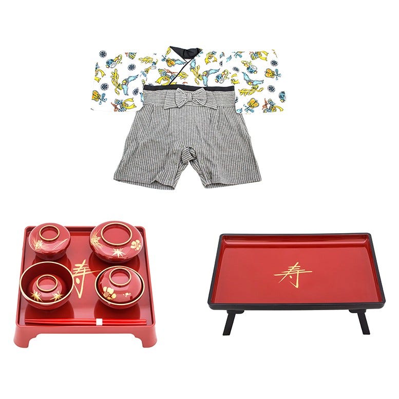 ・男の子用 お食い初め初膳 食器セット(お膳、飯椀、汁椀、つぼ椀、平椀、お箸)・男女共通 お食い初め二の膳(お頭付き鯛や季節のお菓子などの飾り台)・男の子用 ベビー袴