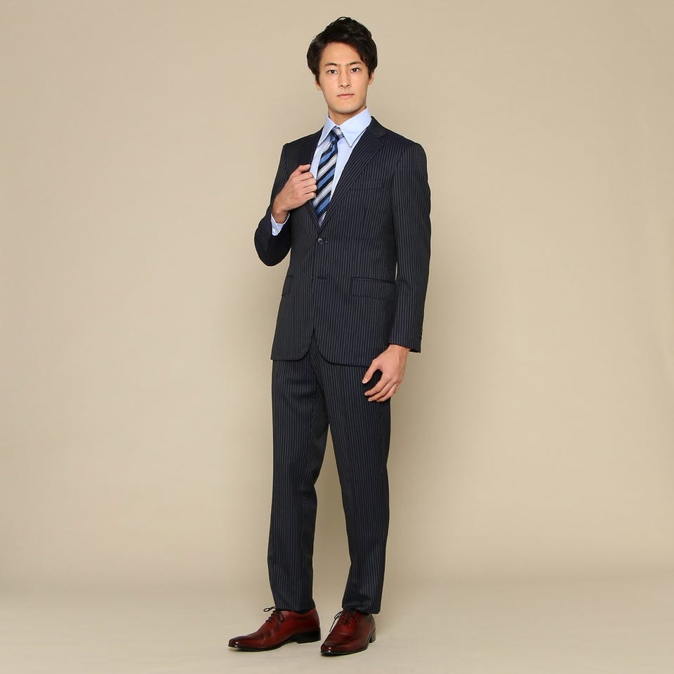 イタリアREDA社の生地を使用したストライプスーツです。ブルー系のネクタイを合わせて爽やかに仕上げるのもおすすめ。ビジネスやパーティーなど、さまざまなシーンでお使いいただけます。