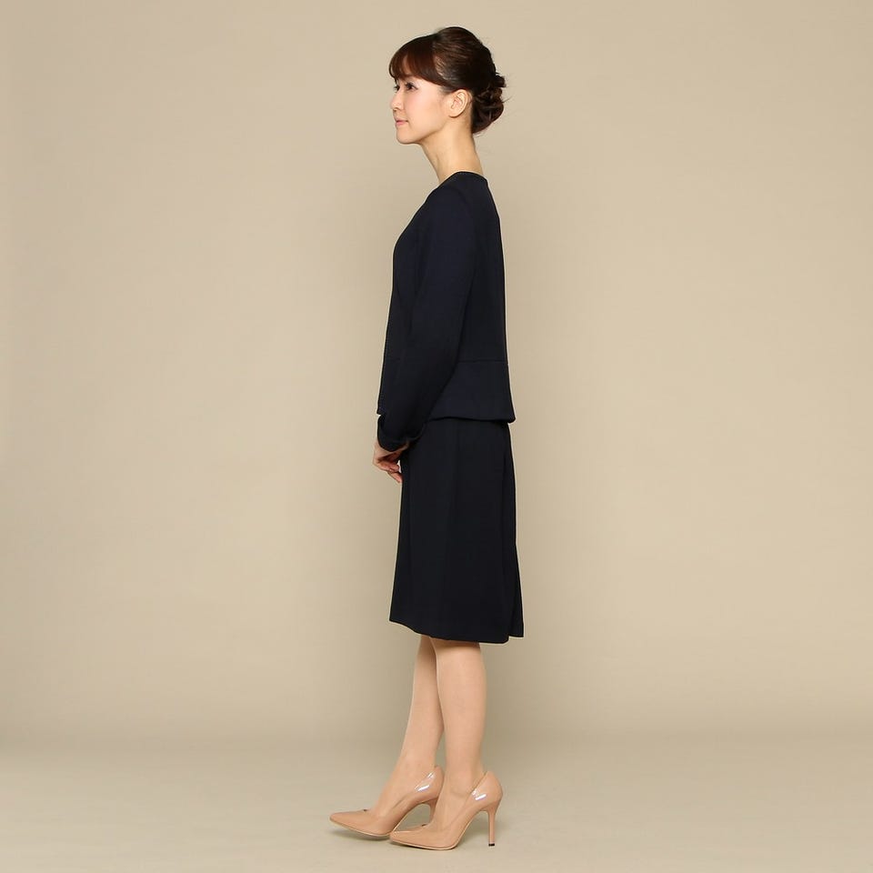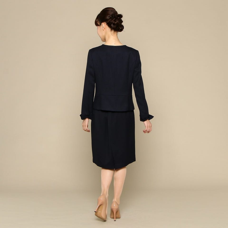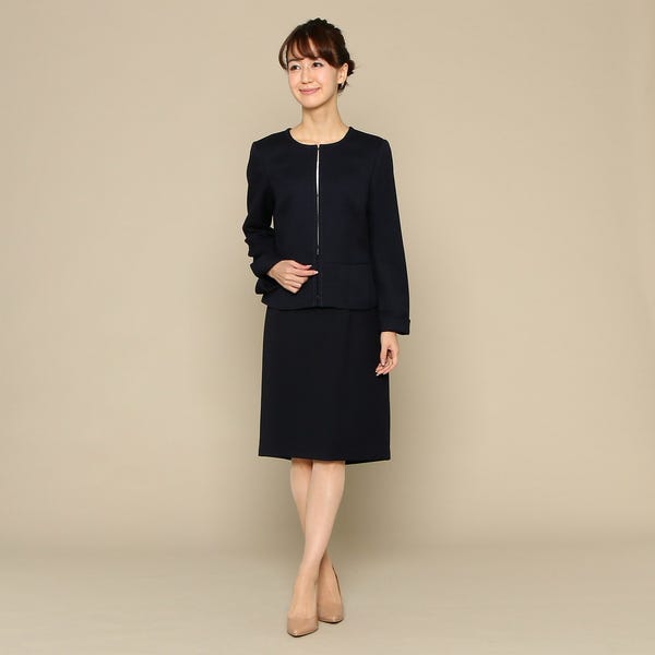 セレモニースーツとしてお使いいただけるシンプルなジャケットとスカートのセットです。ノーカラーのジャケットがすっきりとした首元を演出してくれます。パールのアクセサリーやコサージュを合わせた、エレガントなスタイリングがおすすめです。
