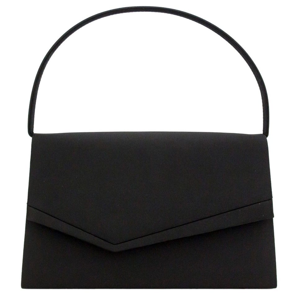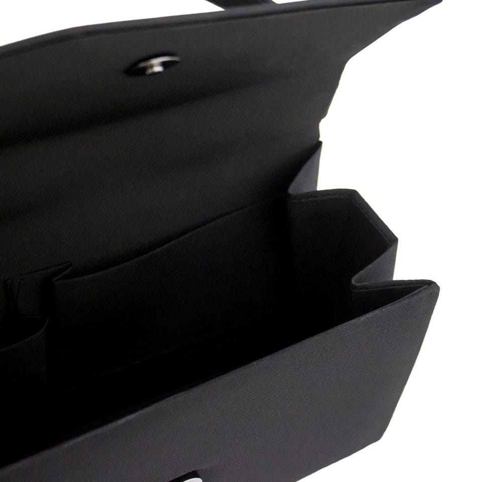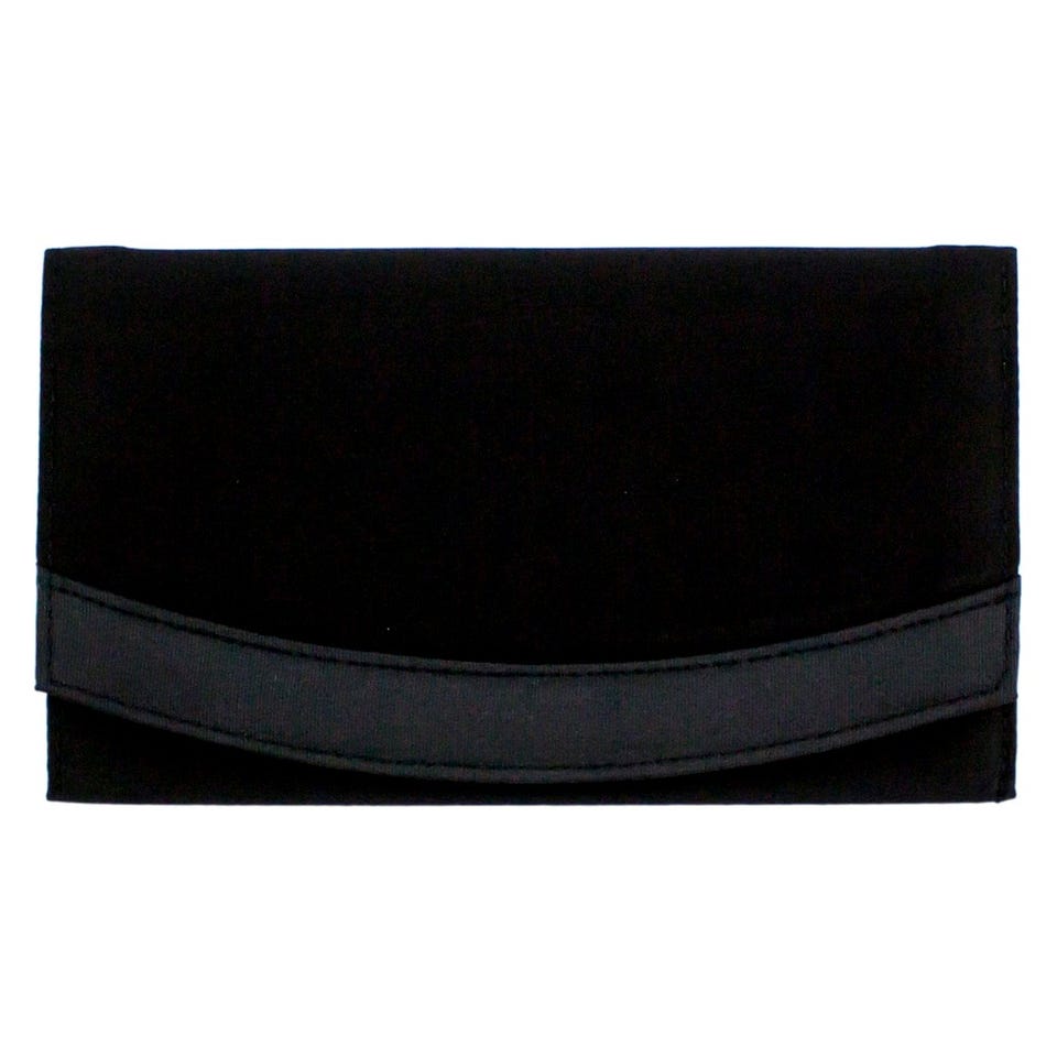 光沢を抑えたサテン素材を使用したシンプルなフォルムが上品なブラックフォーマルバッグ。被せ部分にアシンメトリーデザインを施し、スタイリッシュな仕上がりに。マチが広めなので、荷物の出し入れがとても楽にできます。ふくさとサブバッグがセットになっているのも嬉しいポイント。