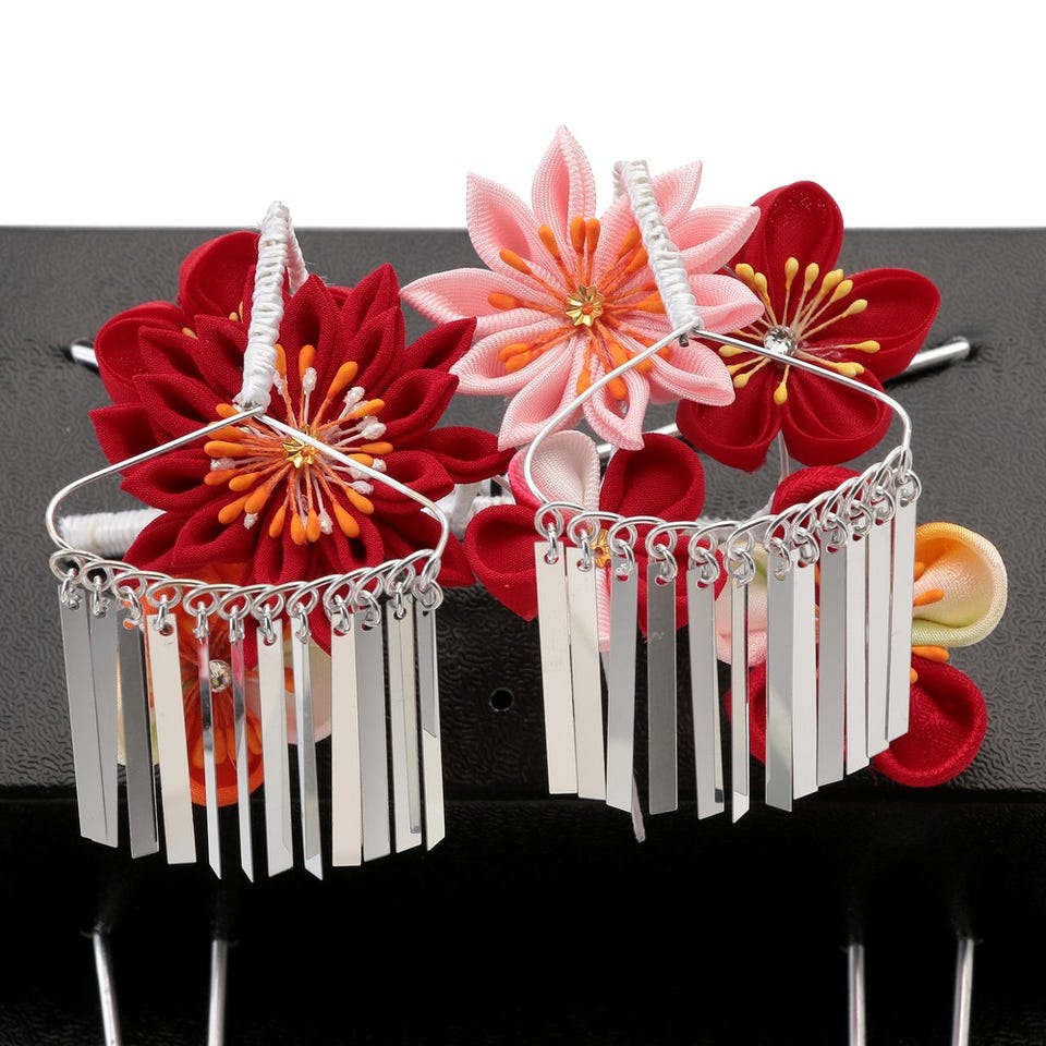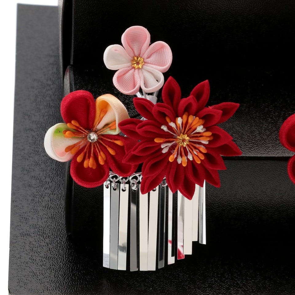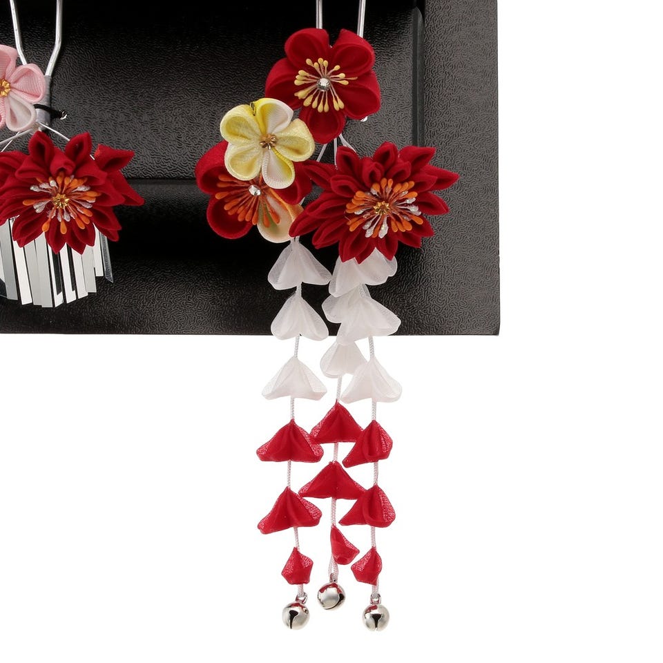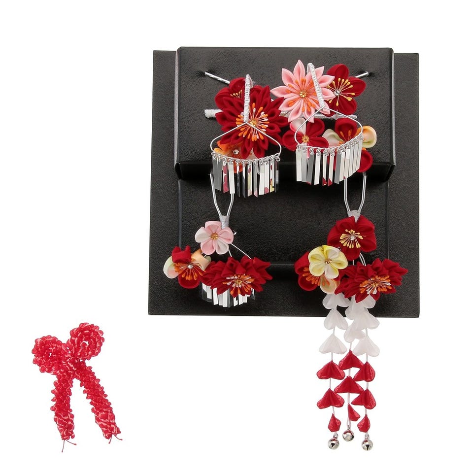 和装用髪飾りちんころとかんざしの4点をセットでお届けします。華やかで可愛らしい雰囲気に仕上げます。