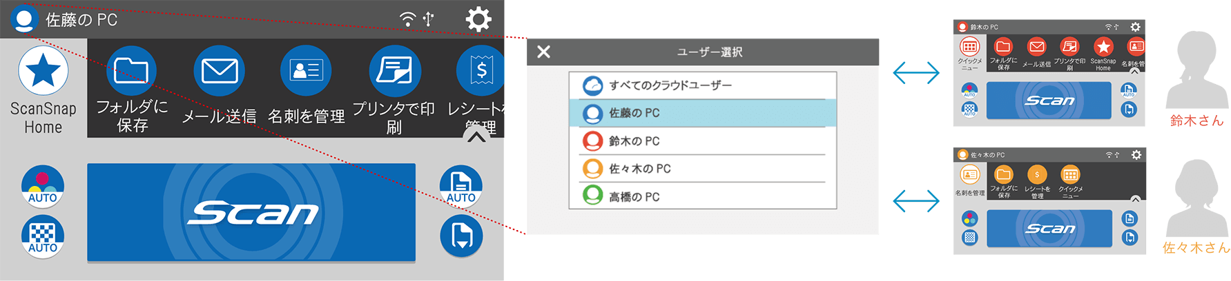 用途に合わせてアイコンをタッチパネルに登録。[Scan]ボタンをワンタッチするだけで整理・活用までをスムーズに行えます。
