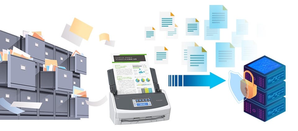 ネットワークHDD(NAS)やネットワークフォルダーへの保存もタッチパネル操作で簡単。あらかじめ保存先の共有フォルダを設定したアイコンをタッチパネルにセットすれば、タッチパネル操作のみ(PCレス)で、スキャンしたイメージデータをネットワークフォルダーに保存できます。