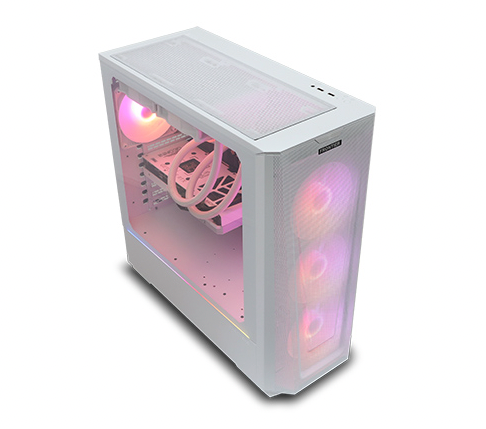 GLシリーズは、4基の光るケースファン(前面3つ、背面1つ)と、SilverStone製 水冷CPUクーラーが備える2基の光るファンを合わせた計6基の光るファンに加え、ケース側面に施したRGB-LEDラインが色鮮やかに光る煌びやかな外観です。白モデルは、グラフィックスカードや水冷CPUクーラーなどのパーツも白色にこだわりました。