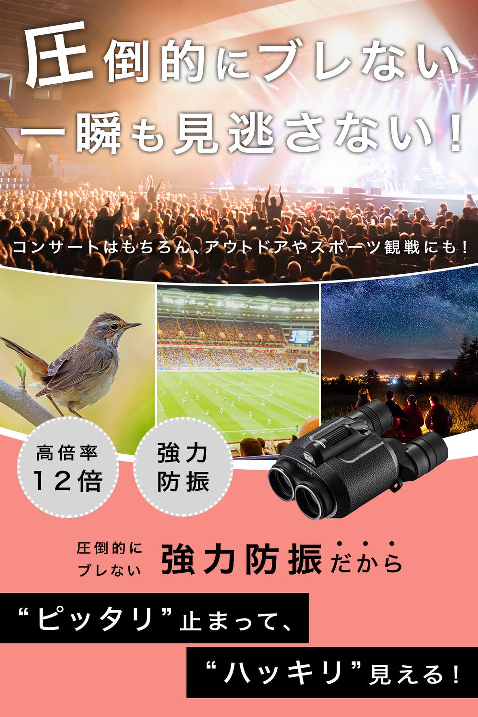 高倍率12倍と強力な防振機能により、コンサート使用時には、「推し」をピッタリ止め、ハッキリ見ることを可能にします。また、アウトドアやスポーツ観戦にも好適。