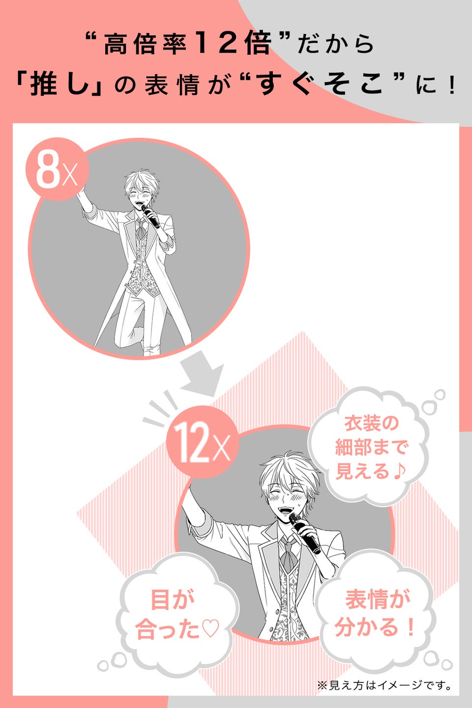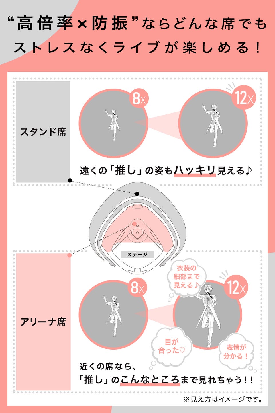 遠い席の場合は、ステージに近い席へ座っているかのように、「推し」が近くに見えます。