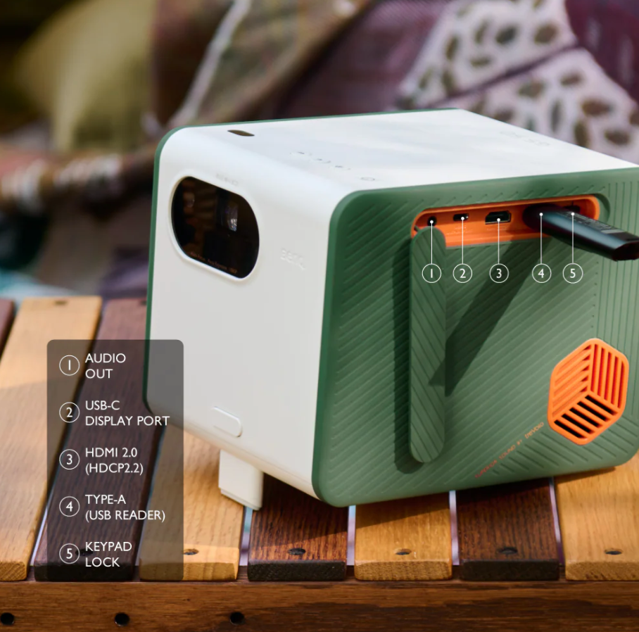 1mm厚のTPU(熱可塑性ポリ)素材のカバーデザインで落下衝撃に対する耐久性に加え、IPX2の防減機能も搭載し、小雨や夜露、誤って飲み物をこぼしたり、といったアウトドアユースのなアクシデントにも対応します。25時間のバッテリー内蔵で屋外でも映画を丸ごと楽しめます。