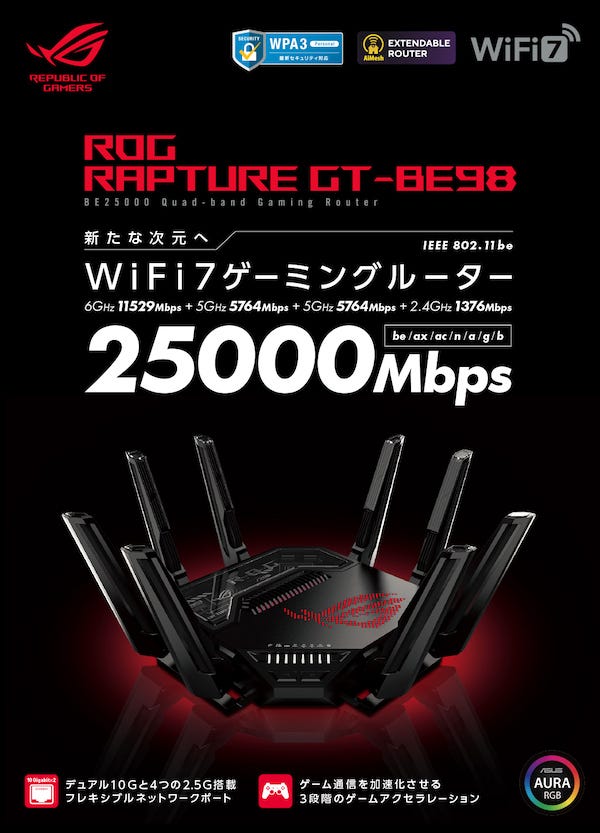 超高速WiFi 7 (802.11be)対応クワッドバンドゲーミングルーターが最大で25,000Mbpsの次世代の超高速スピードを実現します。